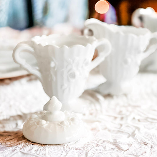 Vintage Rose Petals Soy Candles | Milk Glass Sugar & Creamer Set