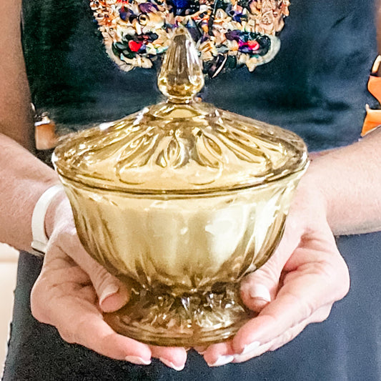 Soy Candle in Vintage Amber Jeannette Glass Candy Dish – Wild Pear & Honey