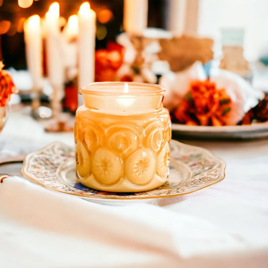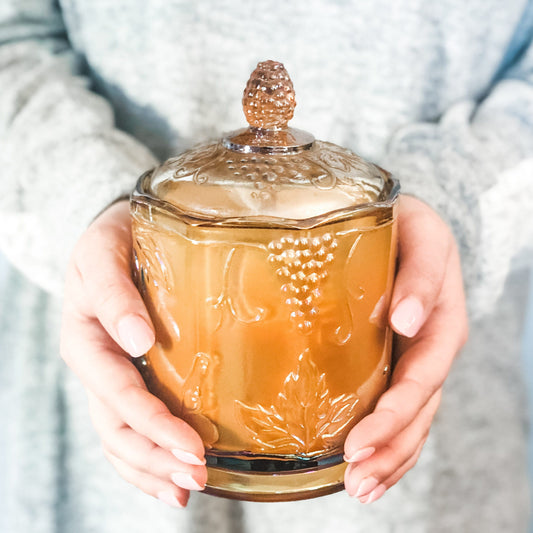 Customizable Vintage Candle in Amber Carnival Glass Jar