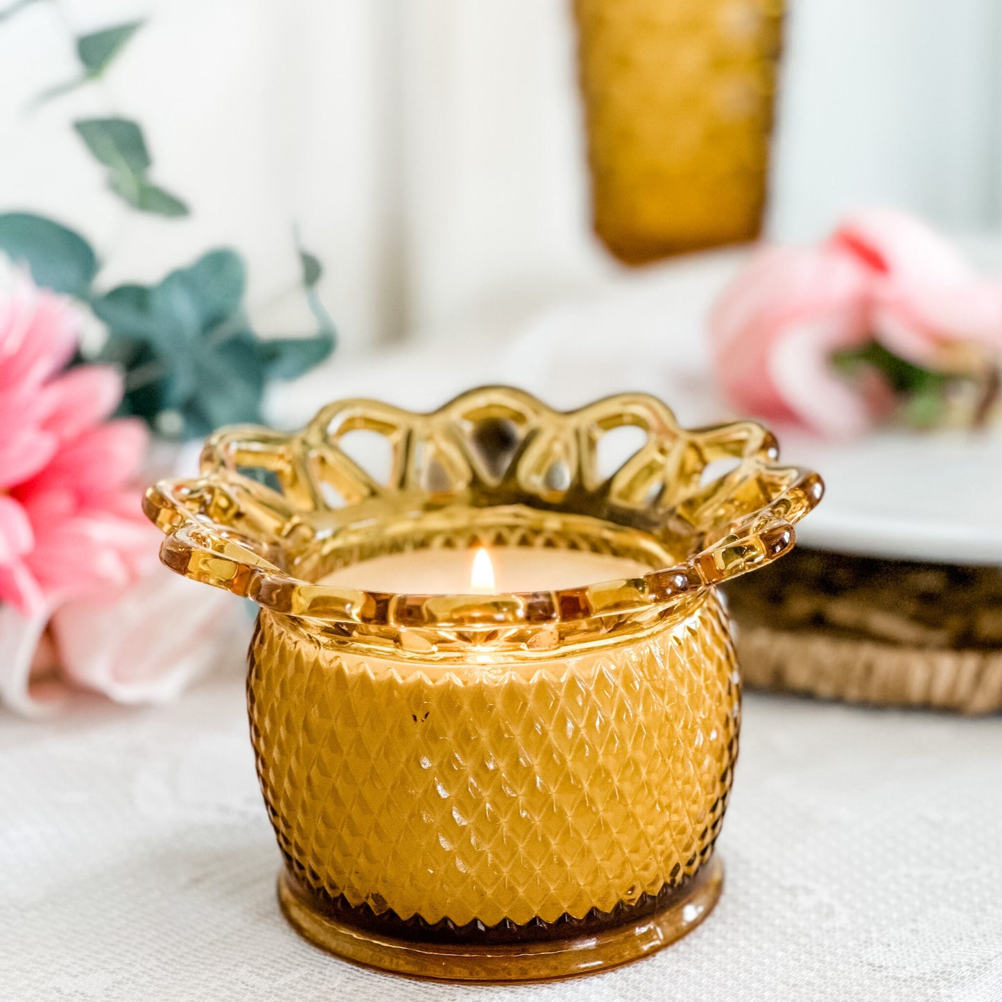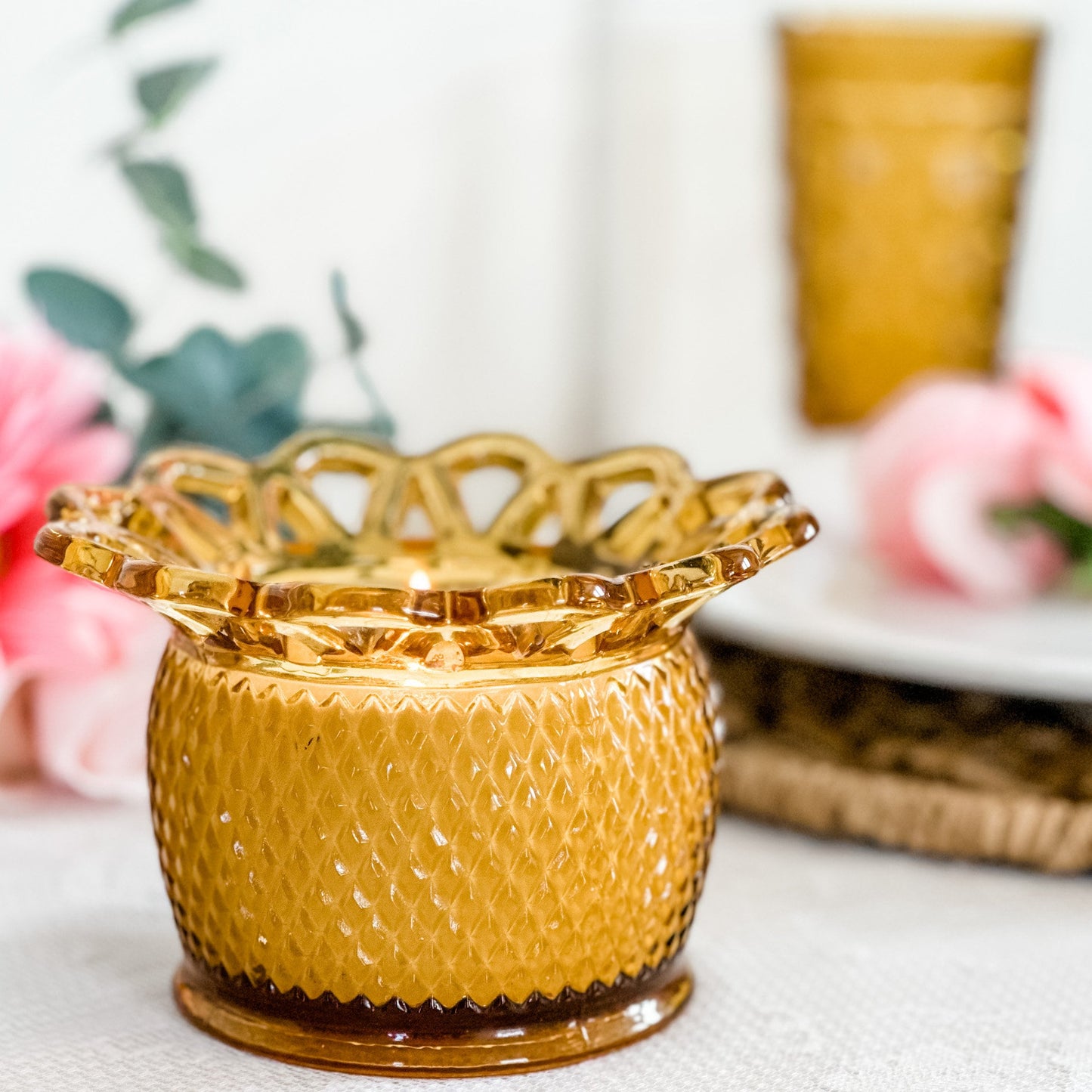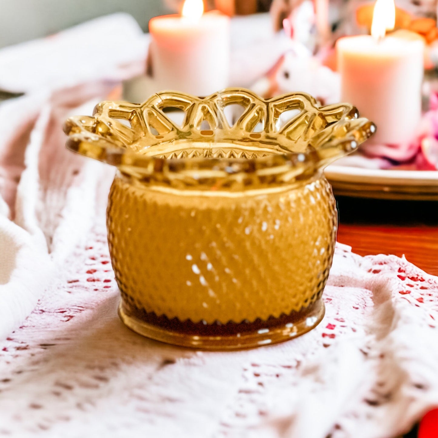 •Scent: Timeless Amber, a sophisticated blend of sandalwood with warm, earthy tones. •Measurements: 6" Diameter including the lace x 3 1/2" Height •Vessel: Vintage Imperial Amber Planter, crafted in the 1950s
