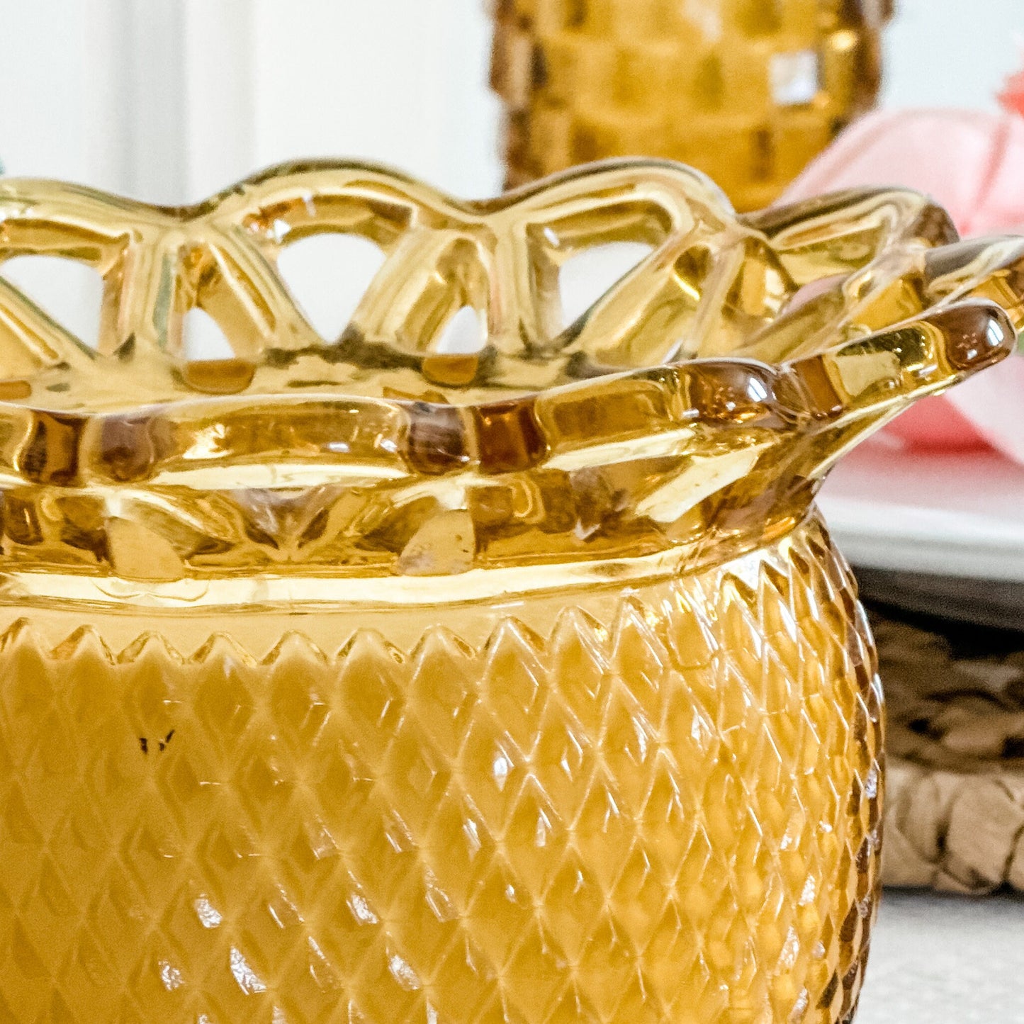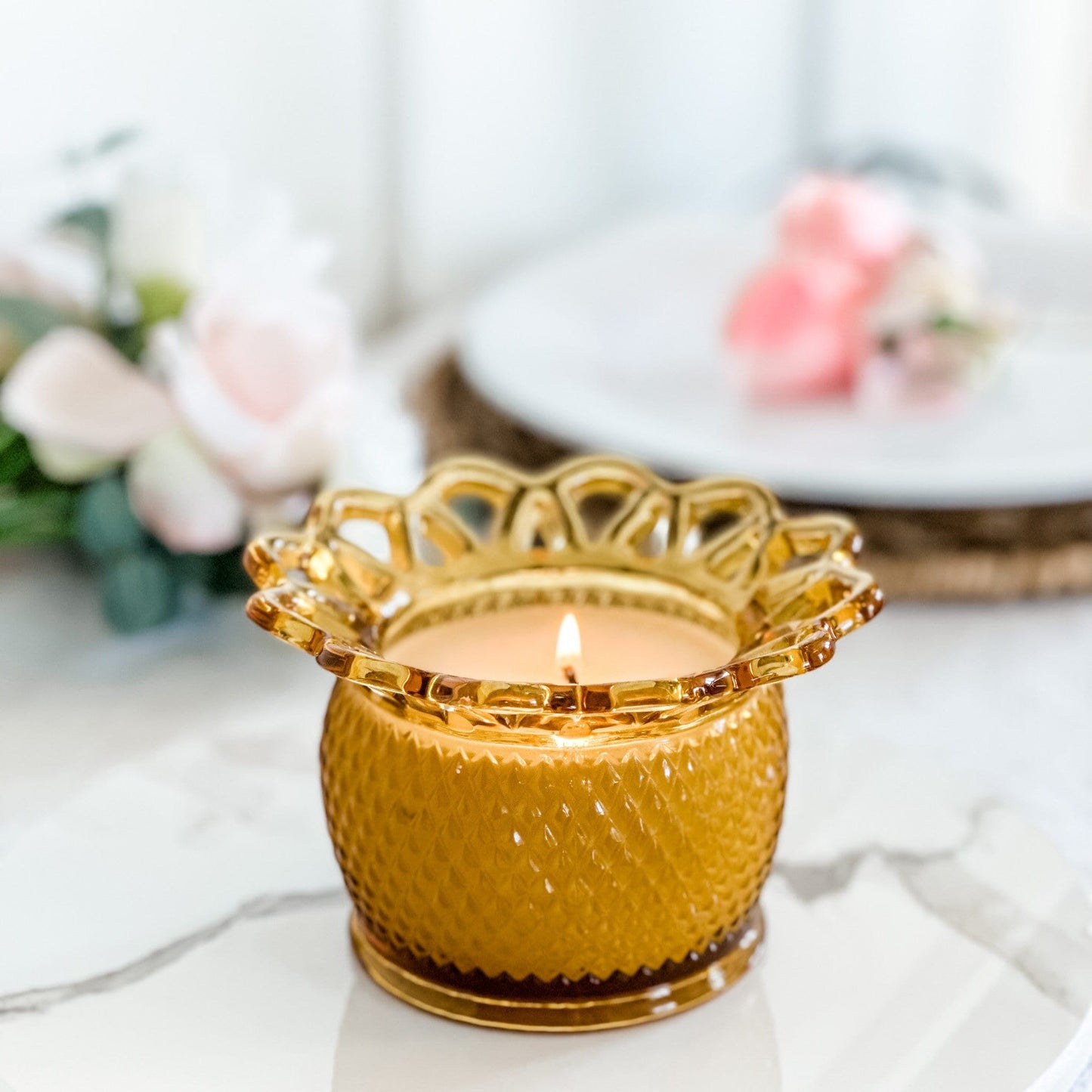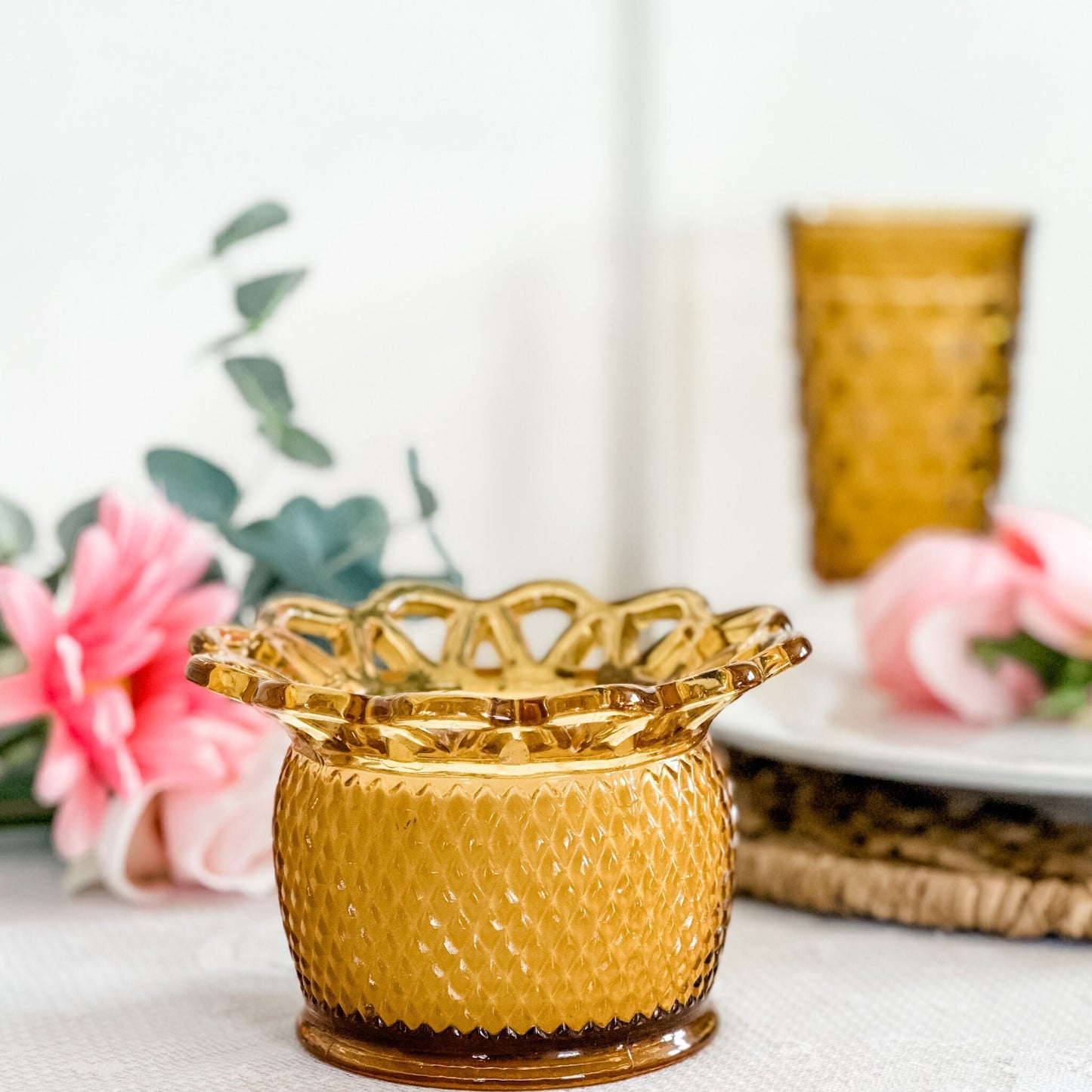 •Scent: Timeless Amber, a sophisticated blend of sandalwood with warm, earthy tones. •Measurements: 6" Diameter including the lace x 3 1/2" Height •Vessel: Vintage Imperial Amber Planter, crafted in the 1950s