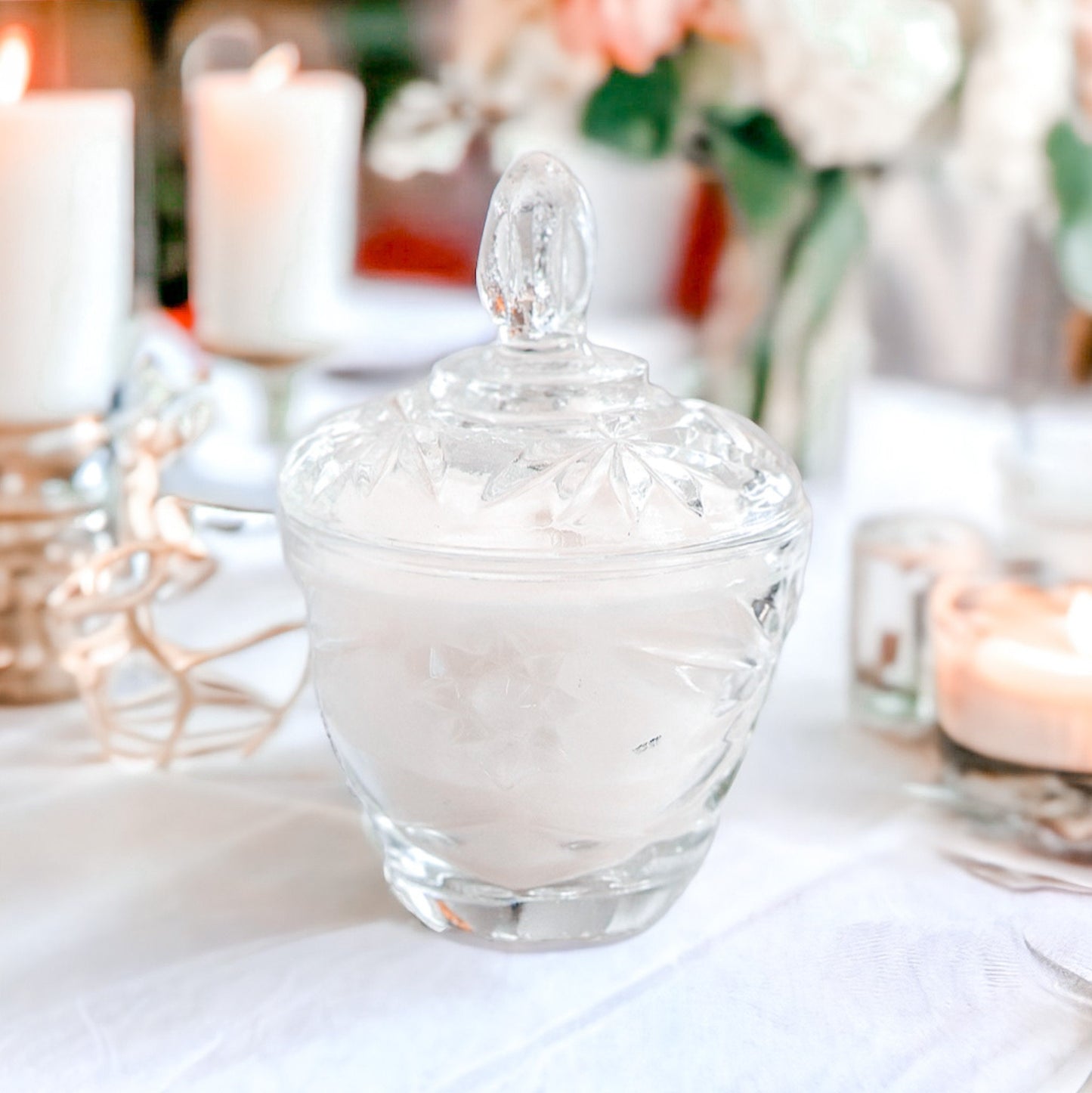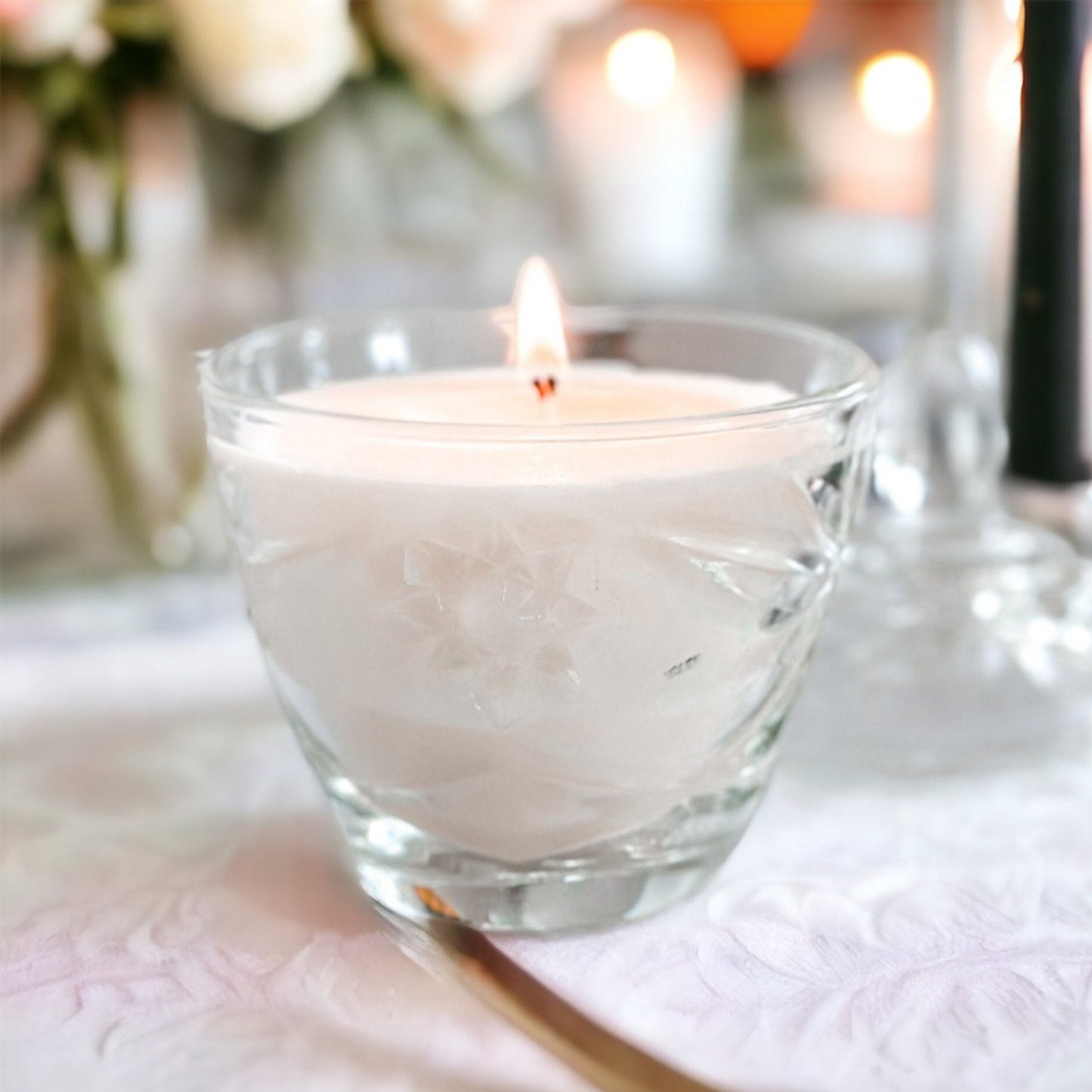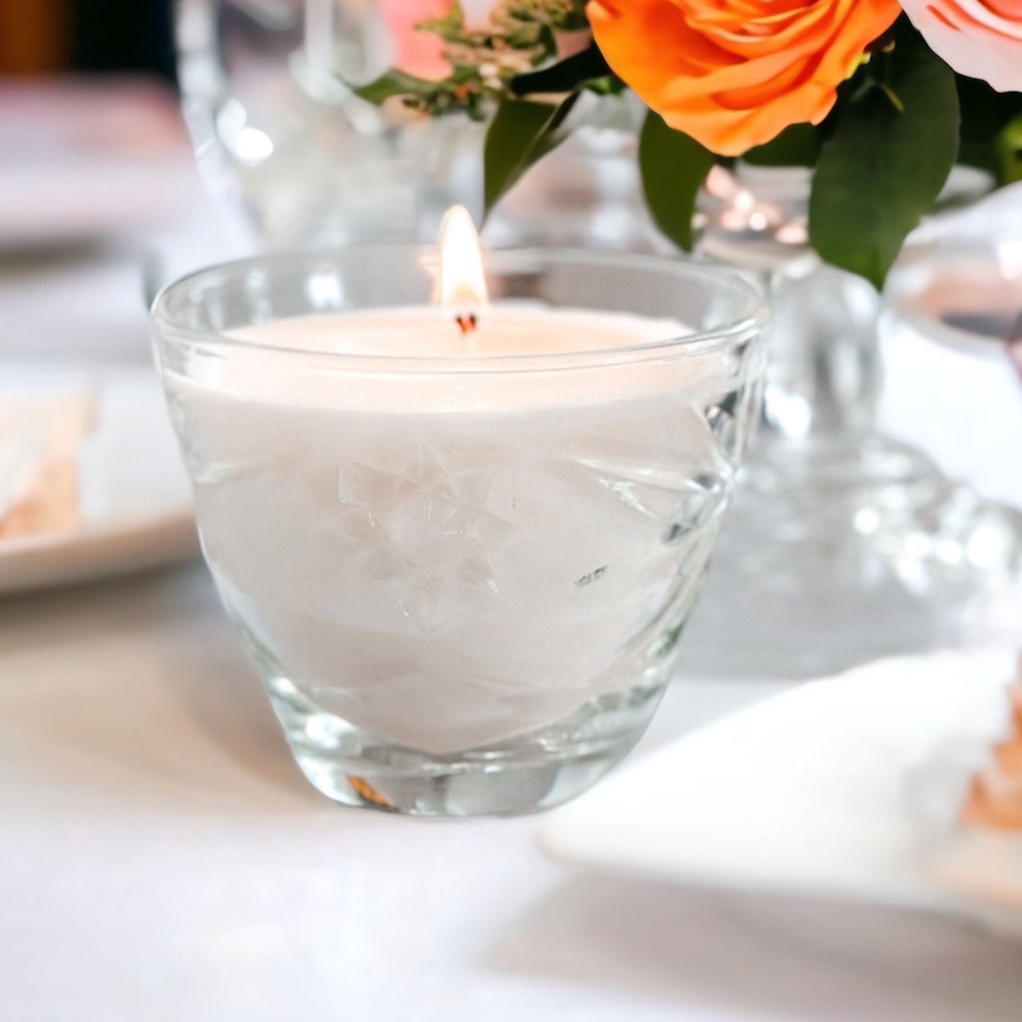 The vessel, a vintage Anchor Hocking Glass Sugar Dish, boasts the charming "Star of David" pattern and adds to the nostalgic appeal with its slight wear. Light the candle and enjoy its fragrance while admiring this delightful piece of repurposed home decor.