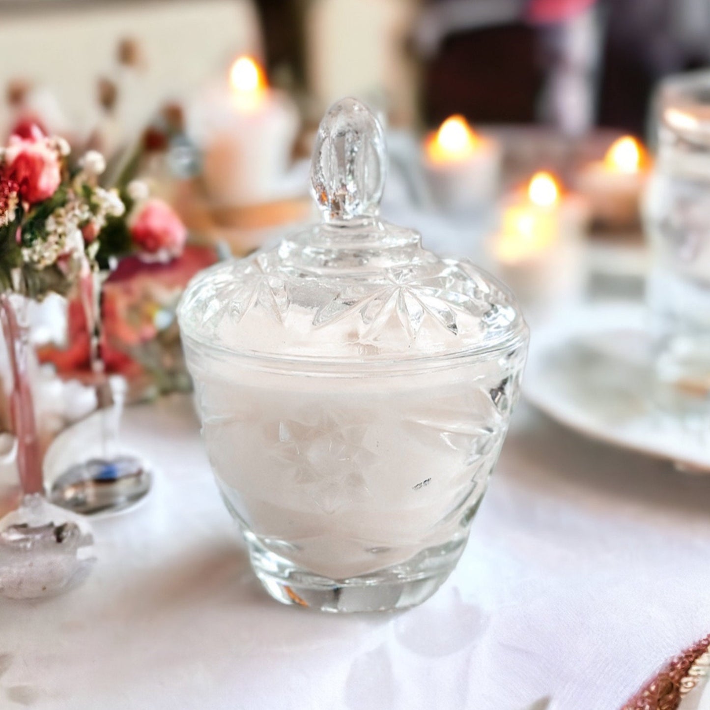 Experience the soothing scent of our Lavender Vanilla Soy Candle, thoughtfully crafted and presented in a Vintage Anchor Hocking Sugar Dish. This delightful fragrance, infused with essential oils of Clary Sage and Lavender, whisks you away to lazy summer afternoons and magical evenings, while the vintage dish adds a unique touch of charm.