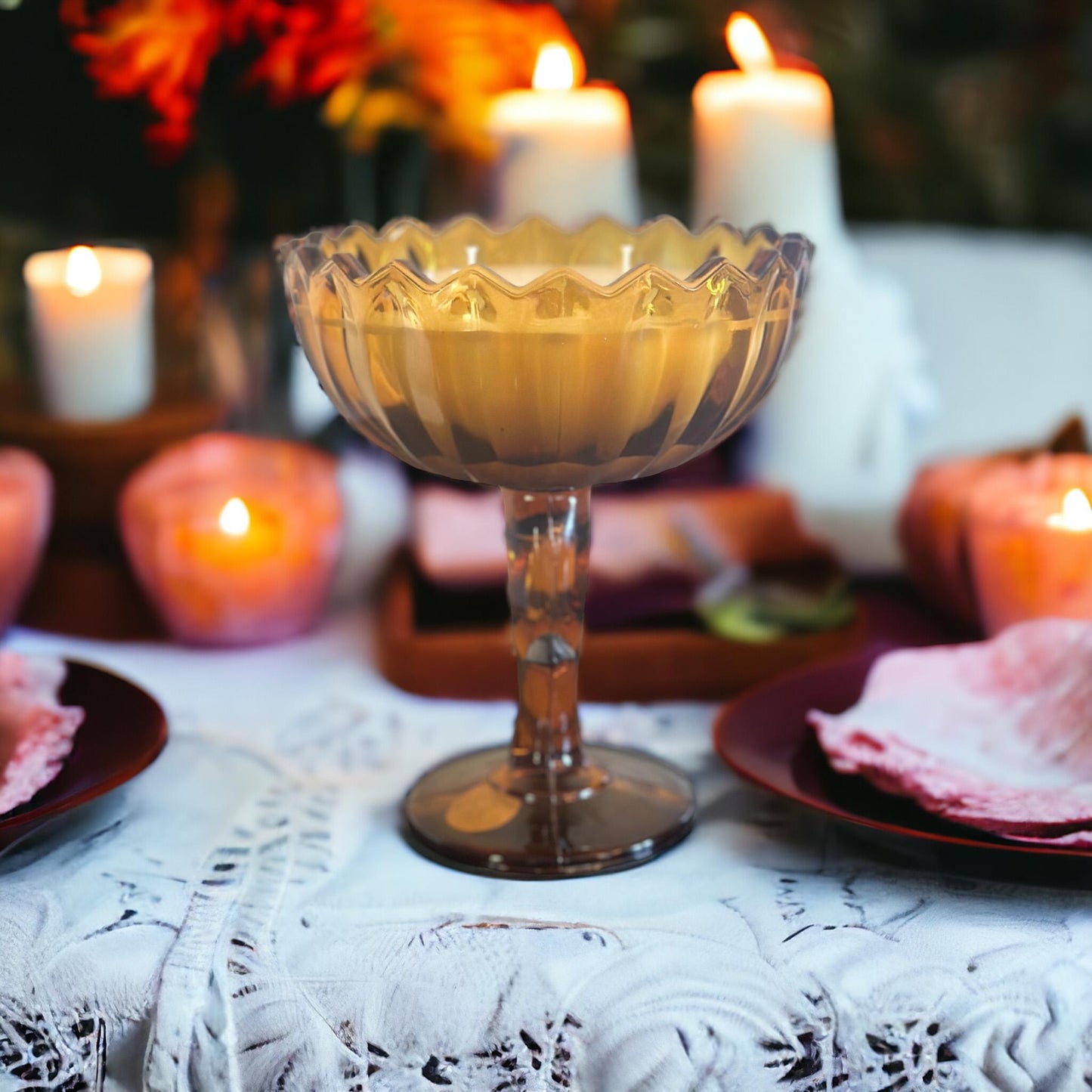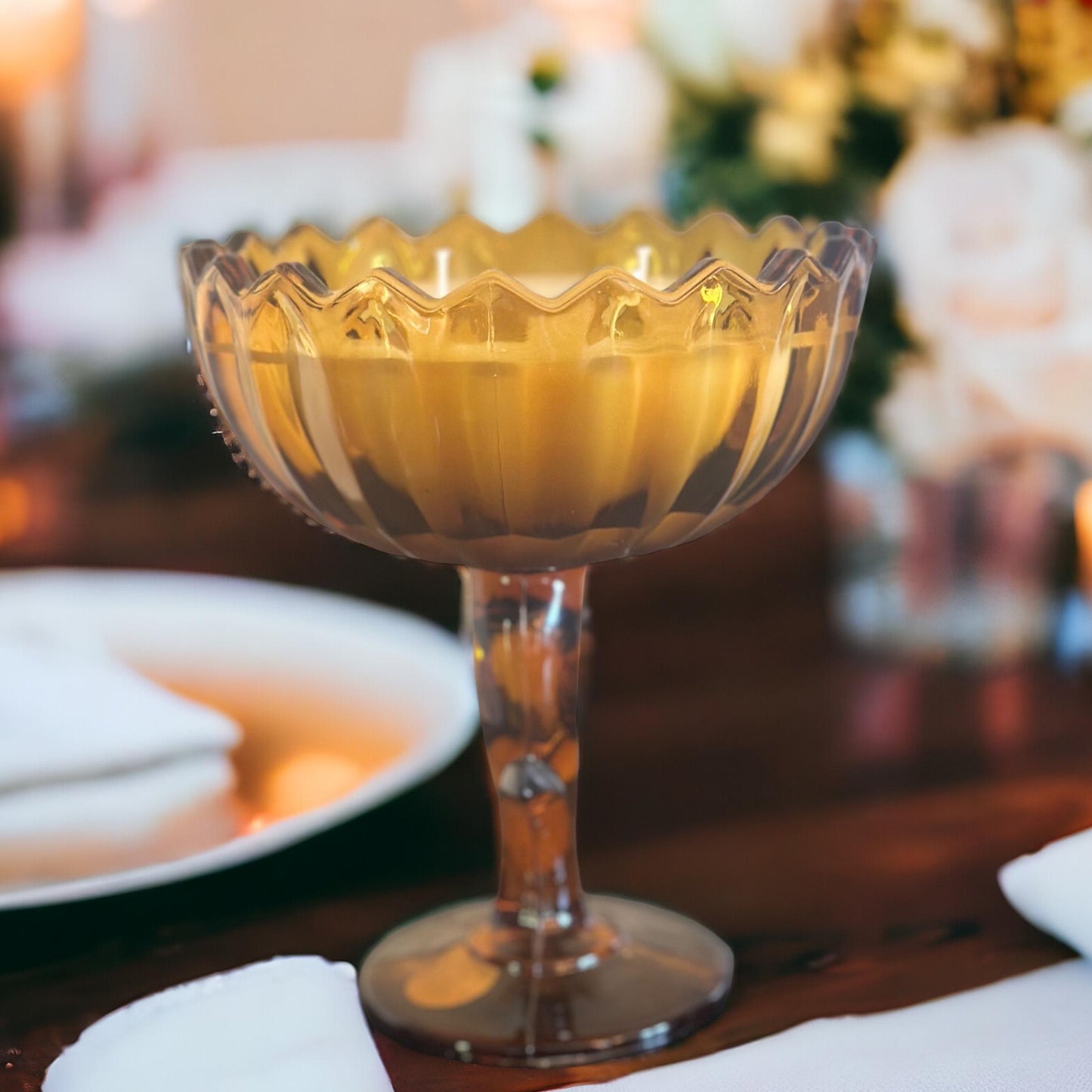 • Scent: Black Currant • Measurements: 7 1/2” Height x 6 1/8” Diameter • Dish: Vintage Amber Lotus Blossom Compote by INDIANA GLASS