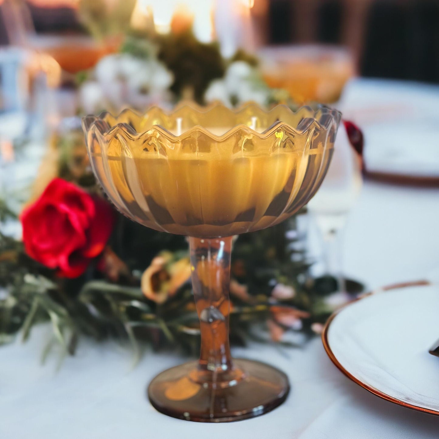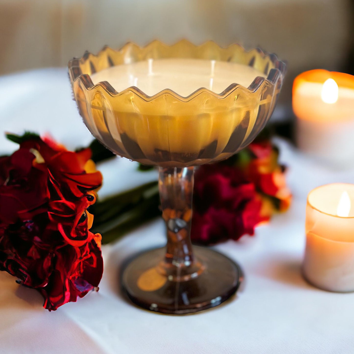 Elevate any room with the luxurious aroma of Black Currant, beautifully presented in a vintage amber Lotus Blossom compote by Indiana Glass. This soy wax candle blends fruity and floral scents, perfect as a sophisticated gift or a stylish addition to your decor.