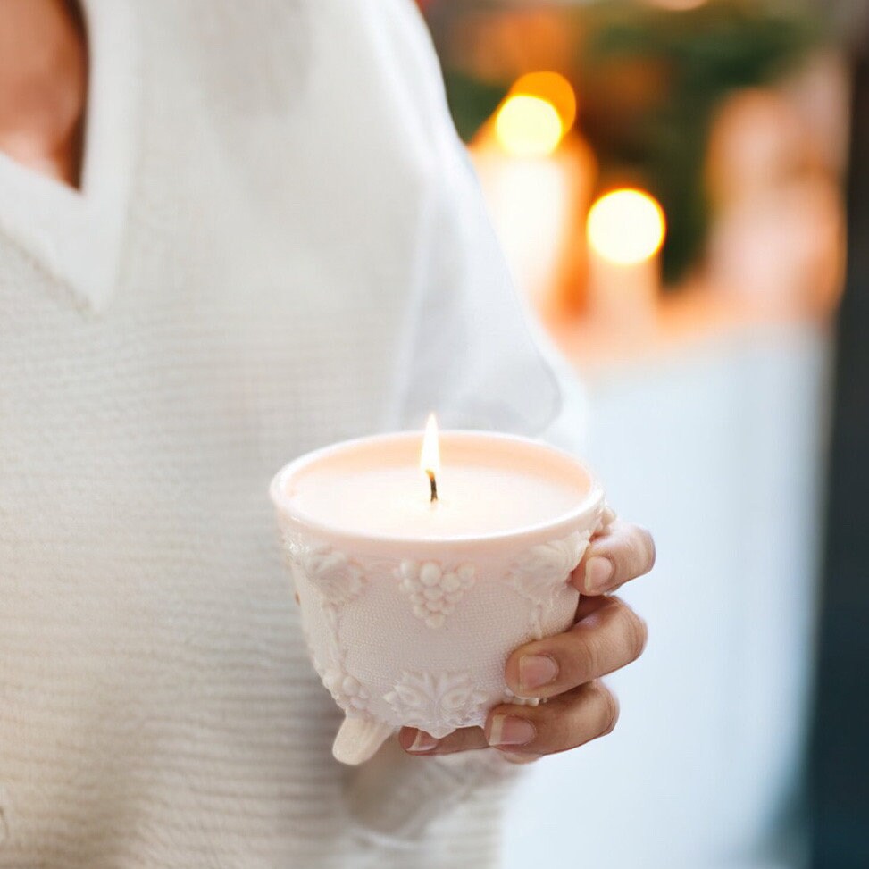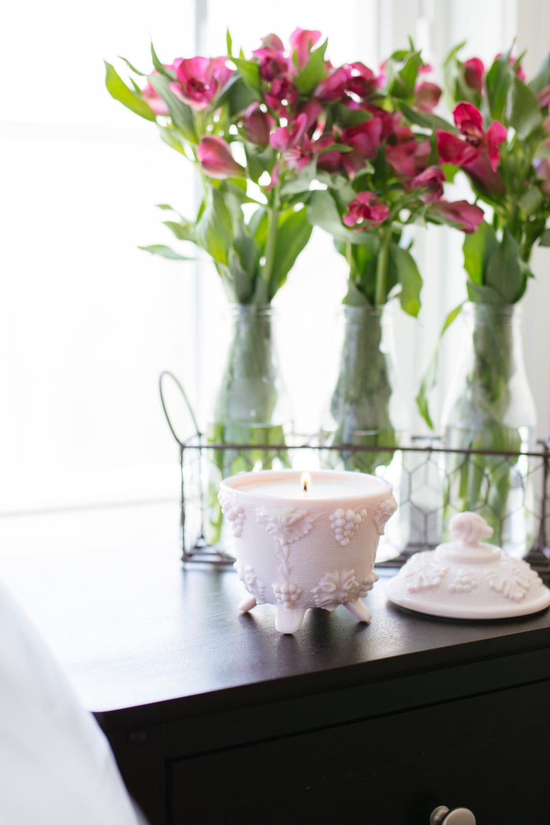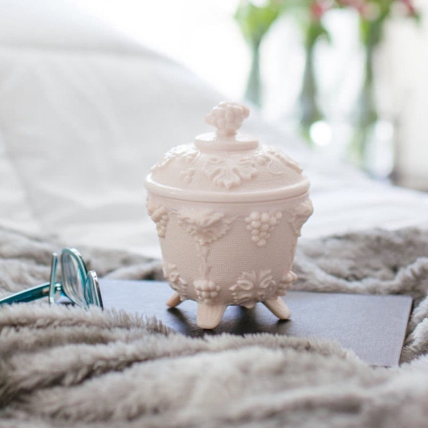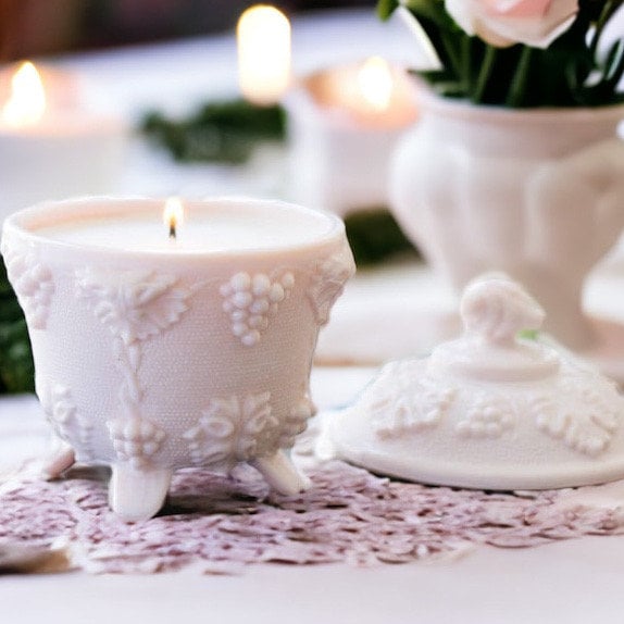 Elevate your space with our pink milk glass candy dish candle. Choose from Lavender Vanilla or Moonflower scents. A perfect blend of vintage charm and delightful fragrance, ideal for gifting or adding charm to your decor.