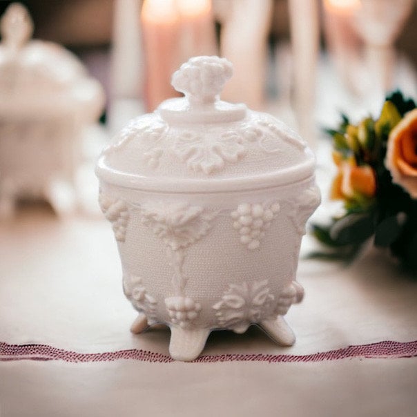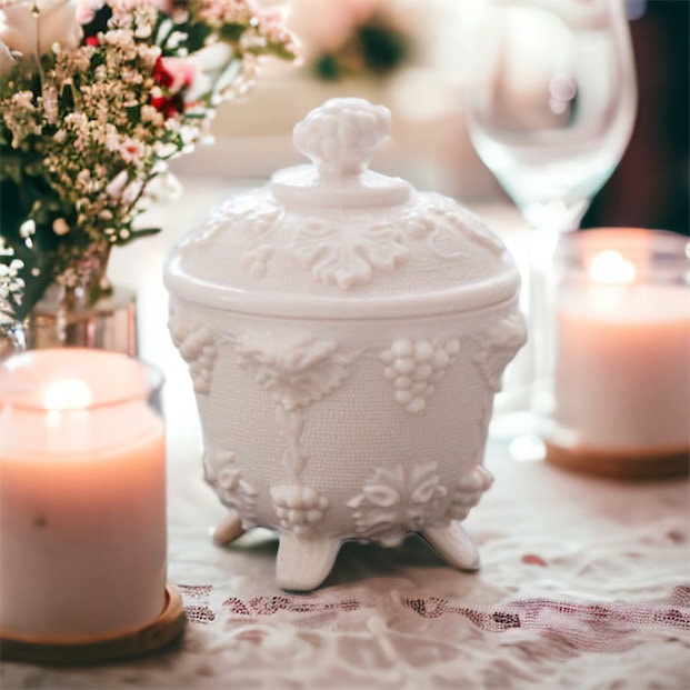 Our romantic candy dish showcases an elegant raised grape and leaf pattern embossed throughout. While it bears the charming marks of its vintage history, this wear only enhances its nostalgic appeal. It's the perfect addition to any vintage decor enthusiast's collection.
