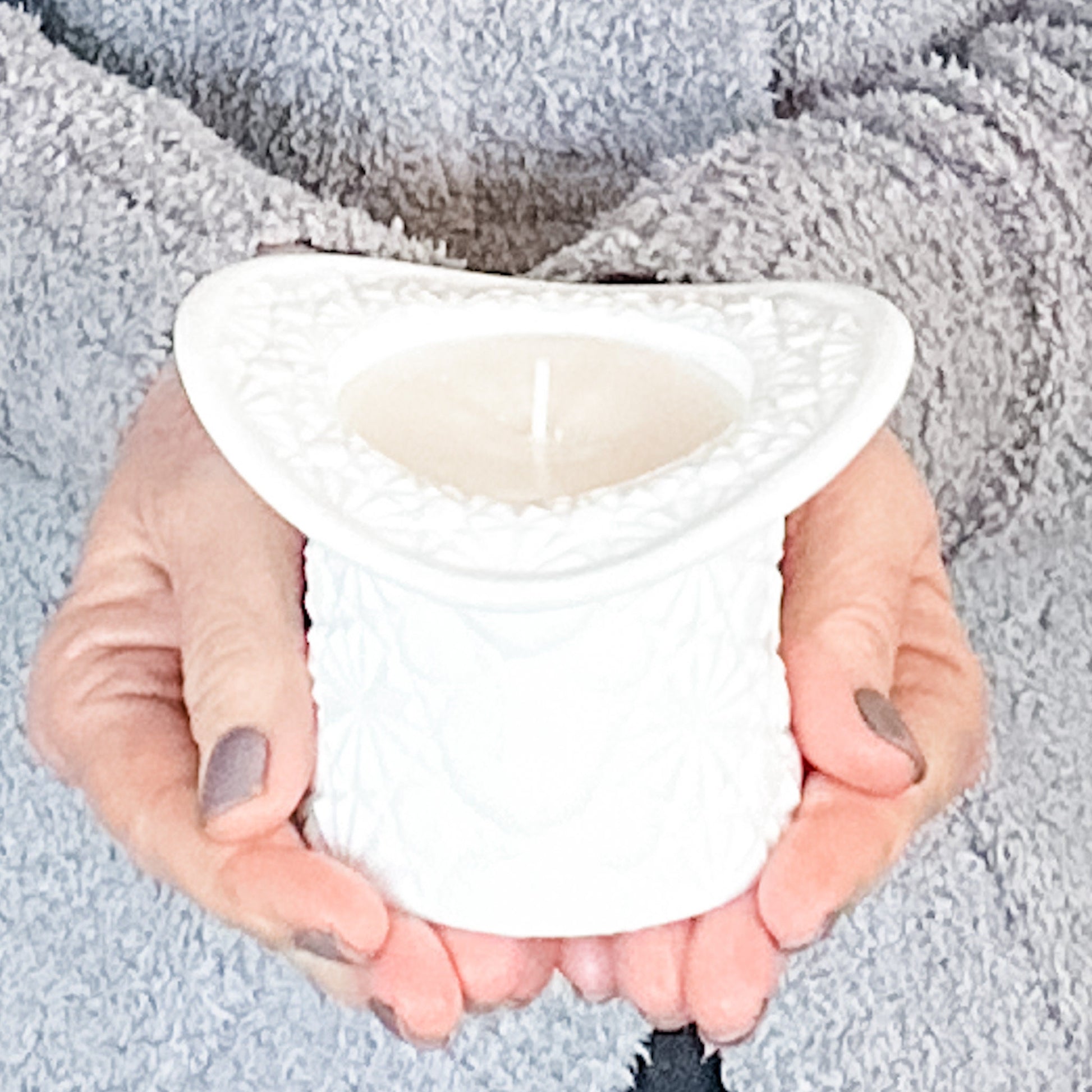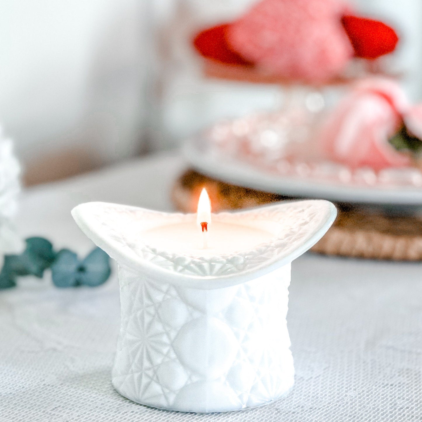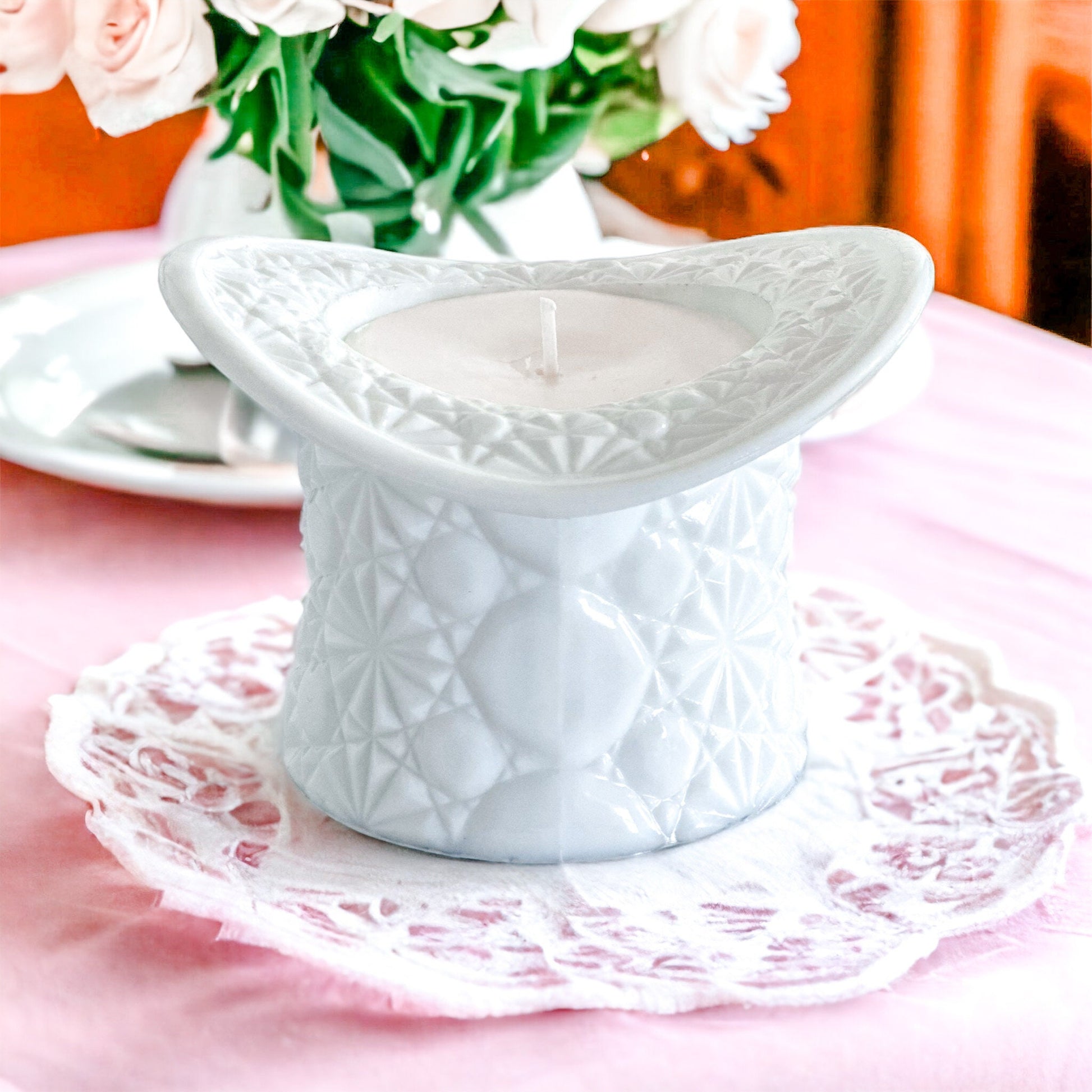 Scent: Moonflower Measurements: 3 1/4" H x 4 1/2" D Dish: Vintage Milk Glass Top Hat, Daisy & Button Pattern #1993, by Fenton, 1960's