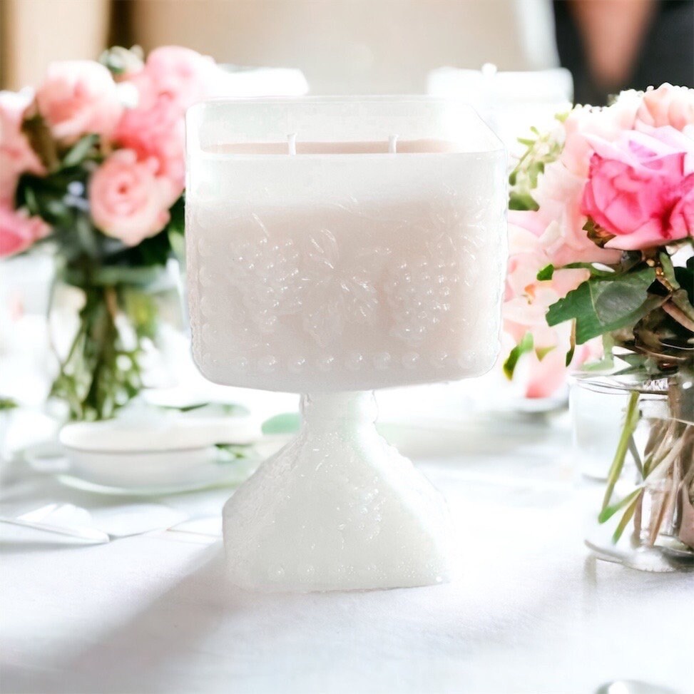 This hand-poured soy candle rests within a Wedding Bowl, a Vintage Milk Glass creation by ANCHOR HOCKING. The dish boasts a scalloped edge and a grape and leaf pattern, bearing slight wear that adds to its nostalgic appeal. A treat for both candle enthusiasts and vintage decor lovers.