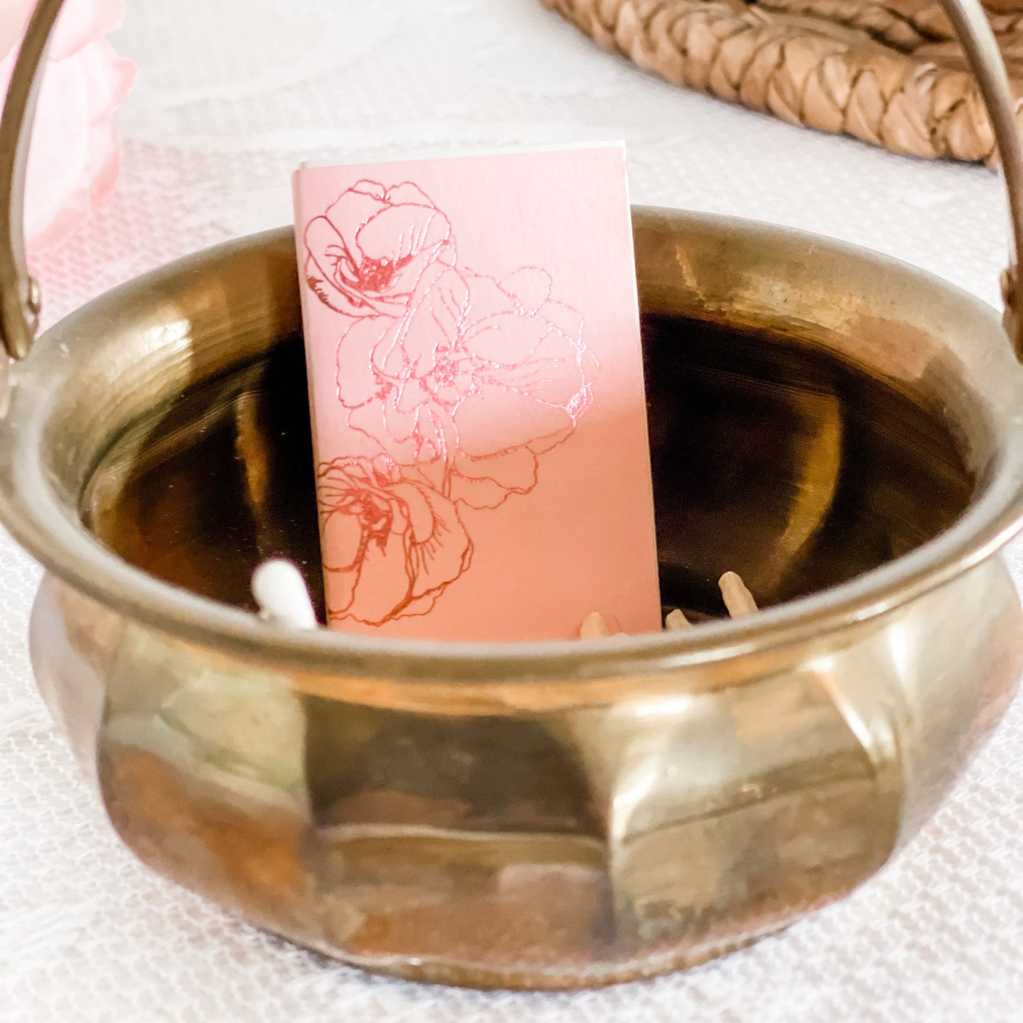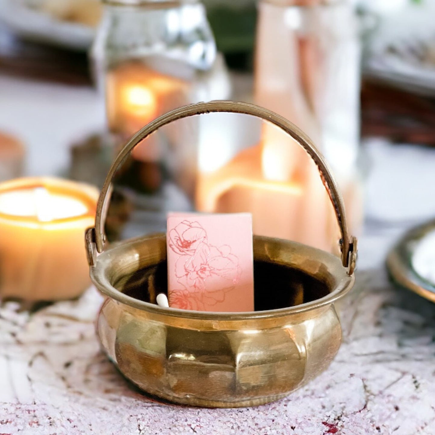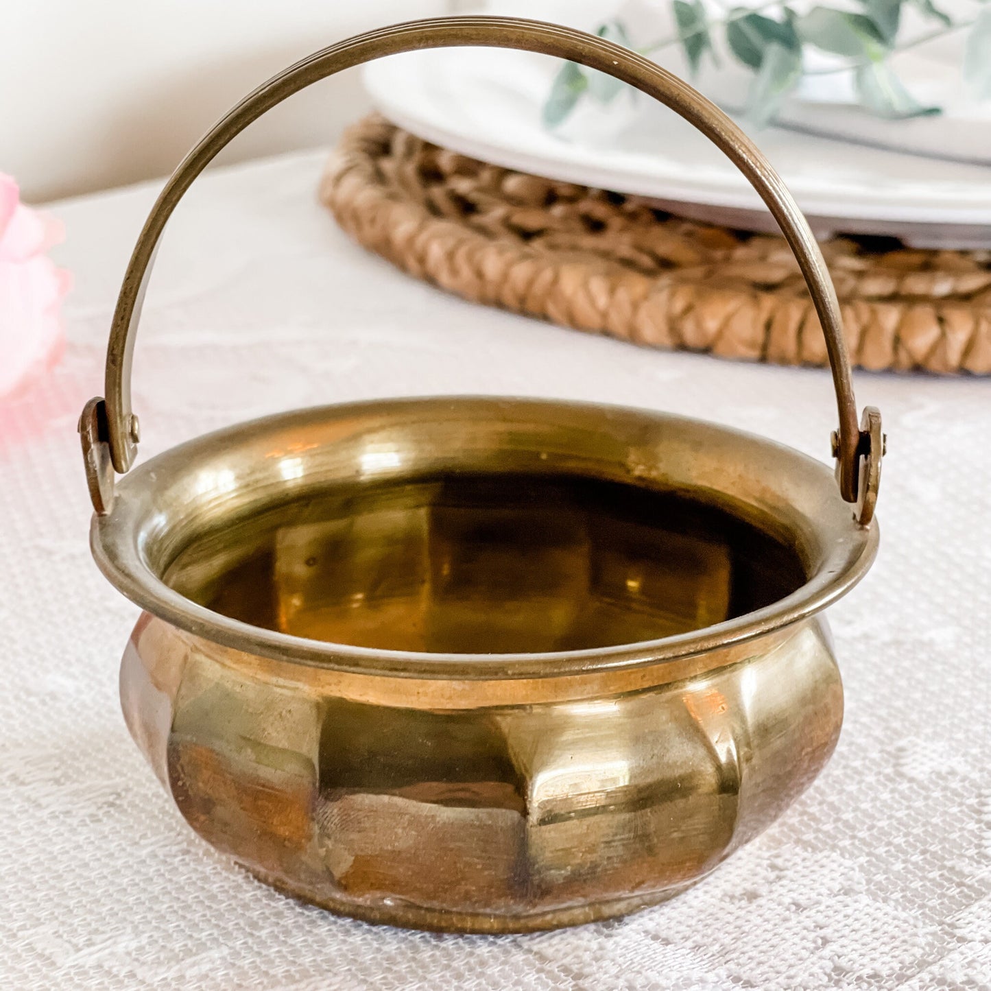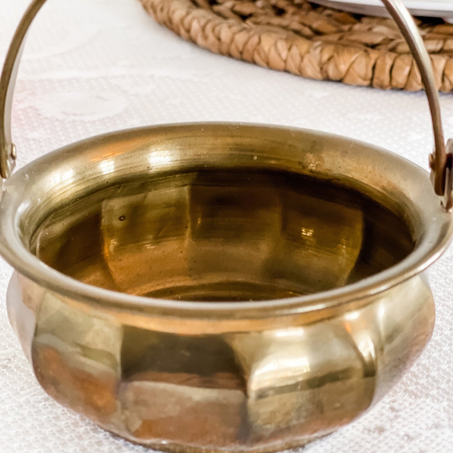 This brass antique trinket dish has a moveable handle and a beautiful patina. As it is a vintage, there is vintage wear but this adds to the nostalgic charm and is ideal for the candle enthusiast who also loves vintage decor.