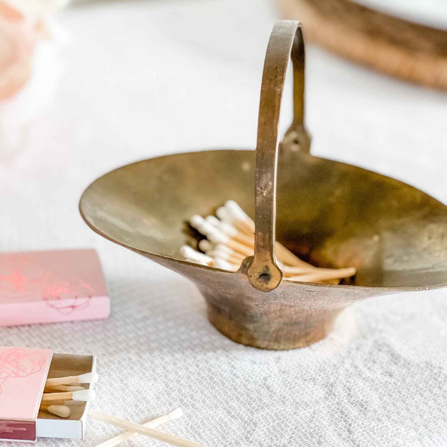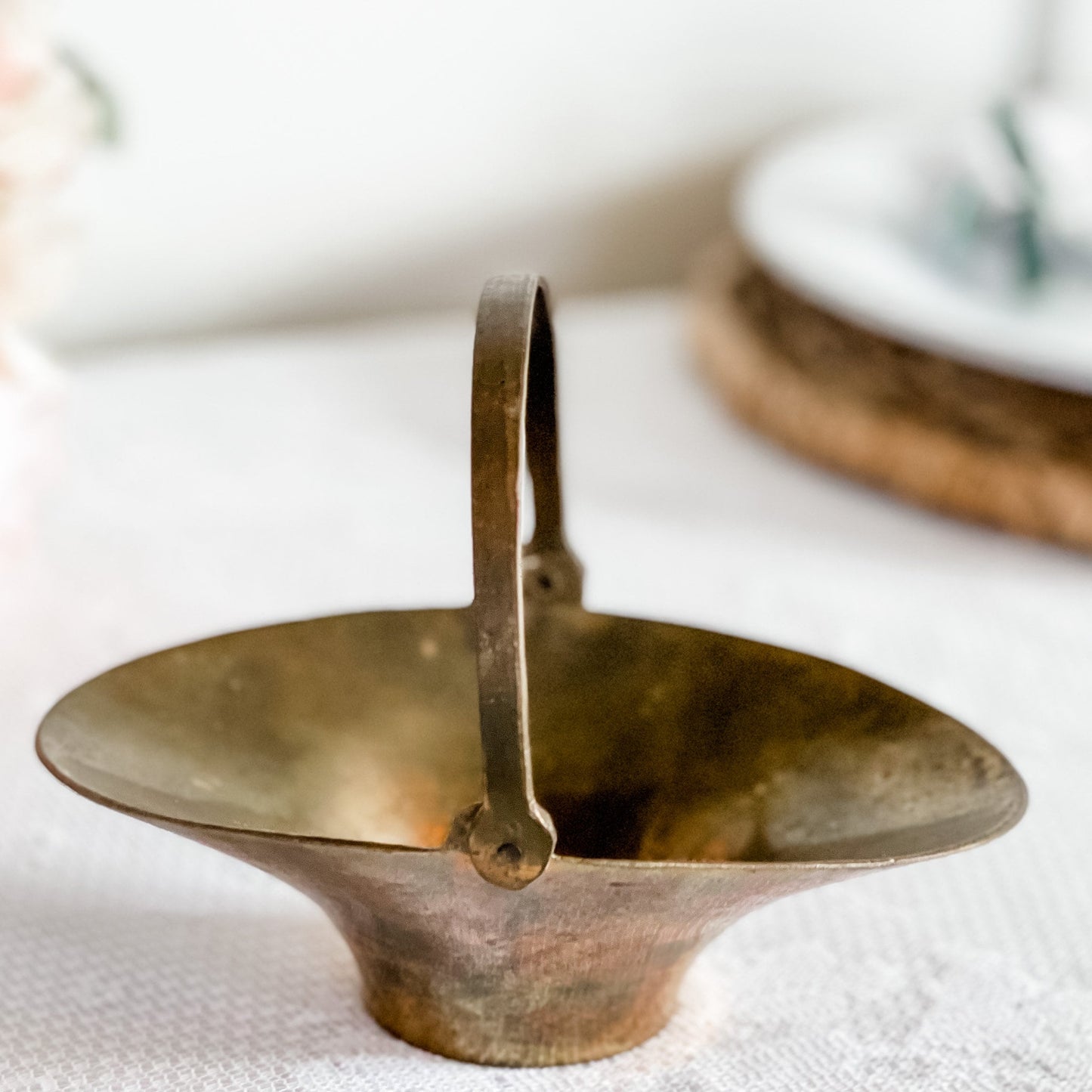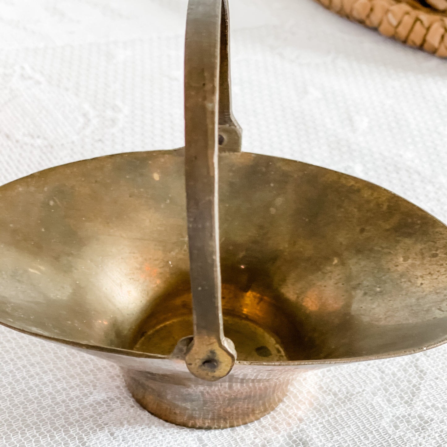 This small mid-century modern trinket basket has a hinged handle and a beautiful patina. As it is a vintage, there is vintage wear but this adds to the nostalgic charm and is ideal for the candle enthusiast who also loves vintage decor.