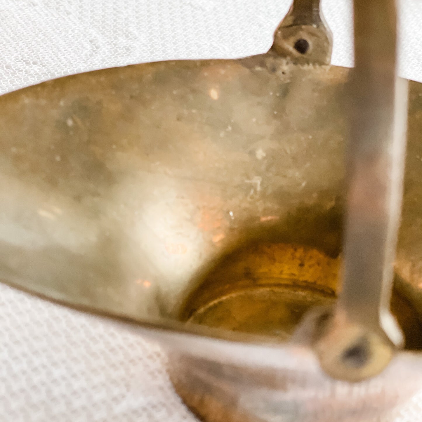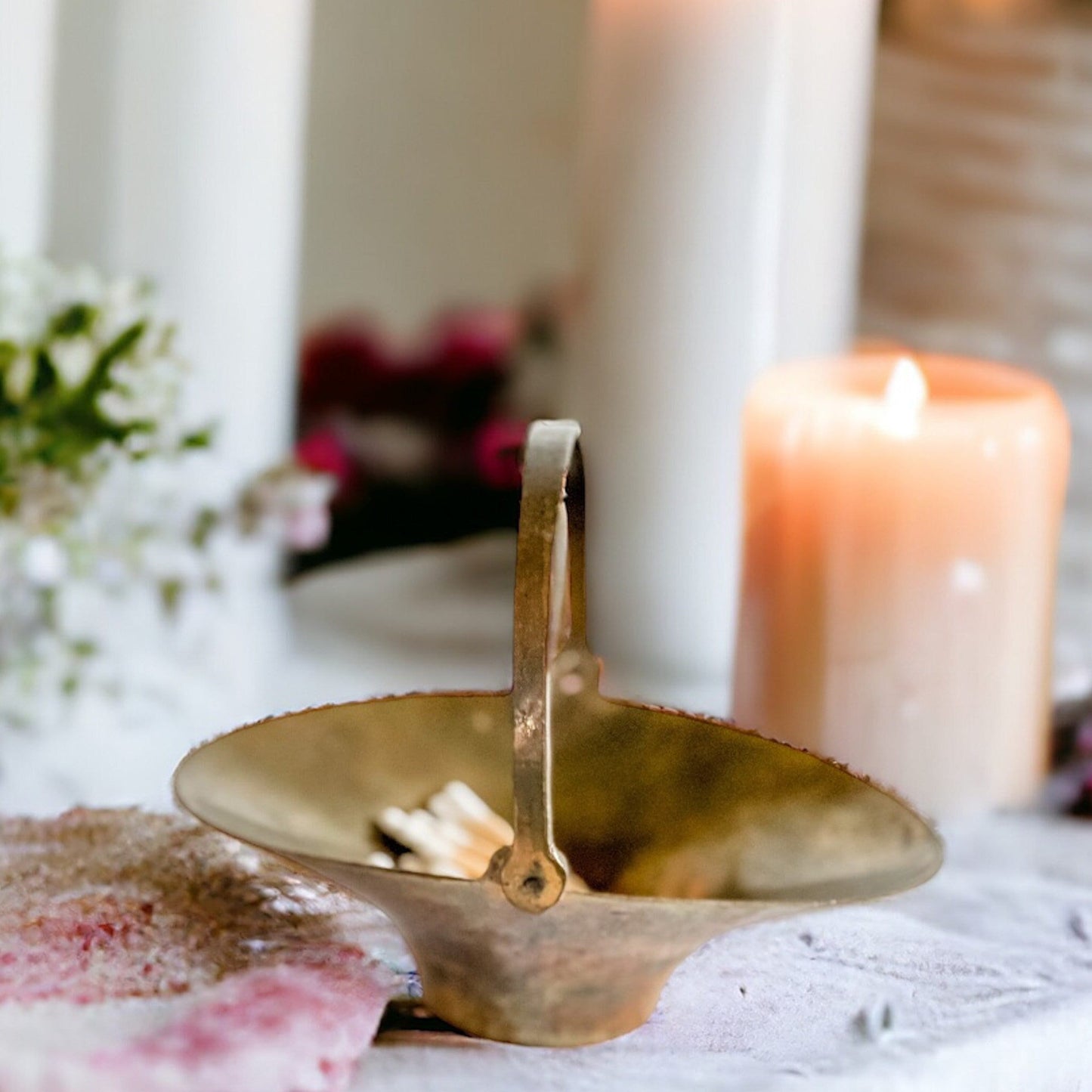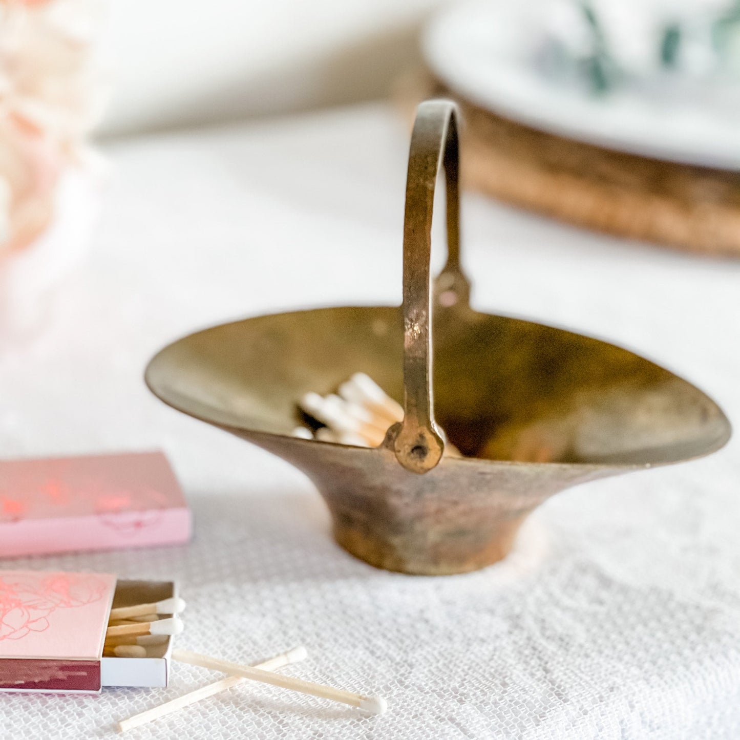 This small mid-century modern trinket basket has a hinged handle and a beautiful patina. As it is a vintage, there is vintage wear but this adds to the nostalgic charm and is ideal for the candle enthusiast who also loves vintage decor.
