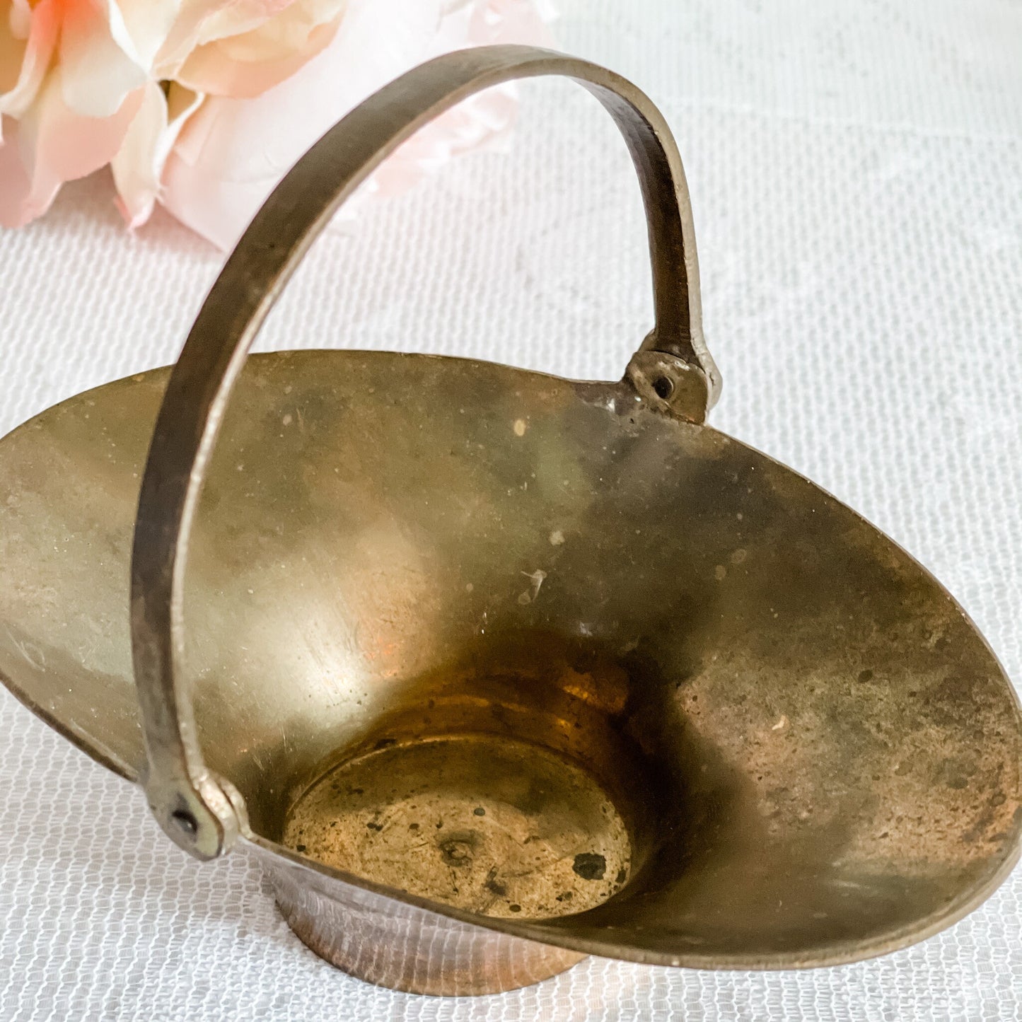 Dish: Vintage Brass Basket Trinket Dish - Stamped India on bottom Measurements: 4 3/4" H with handle x 5 3/4" D Length, 4" D W