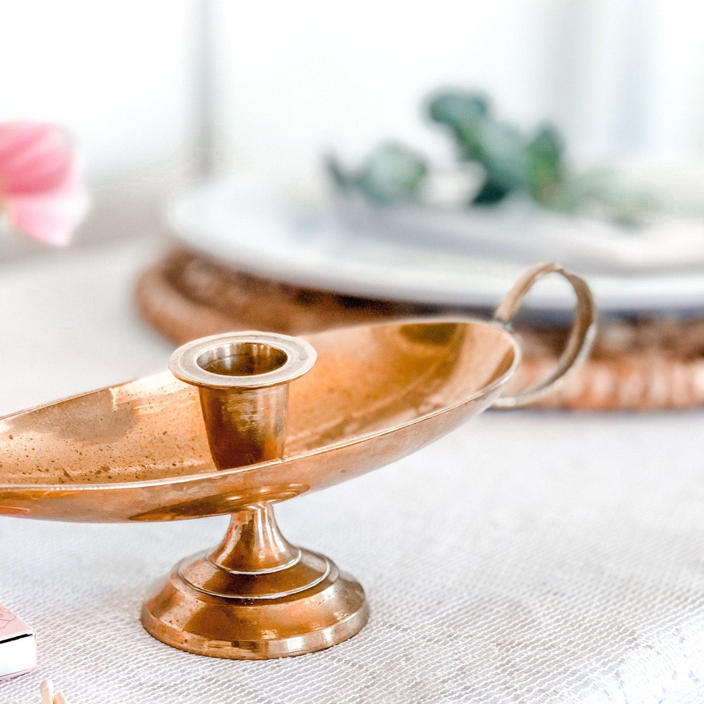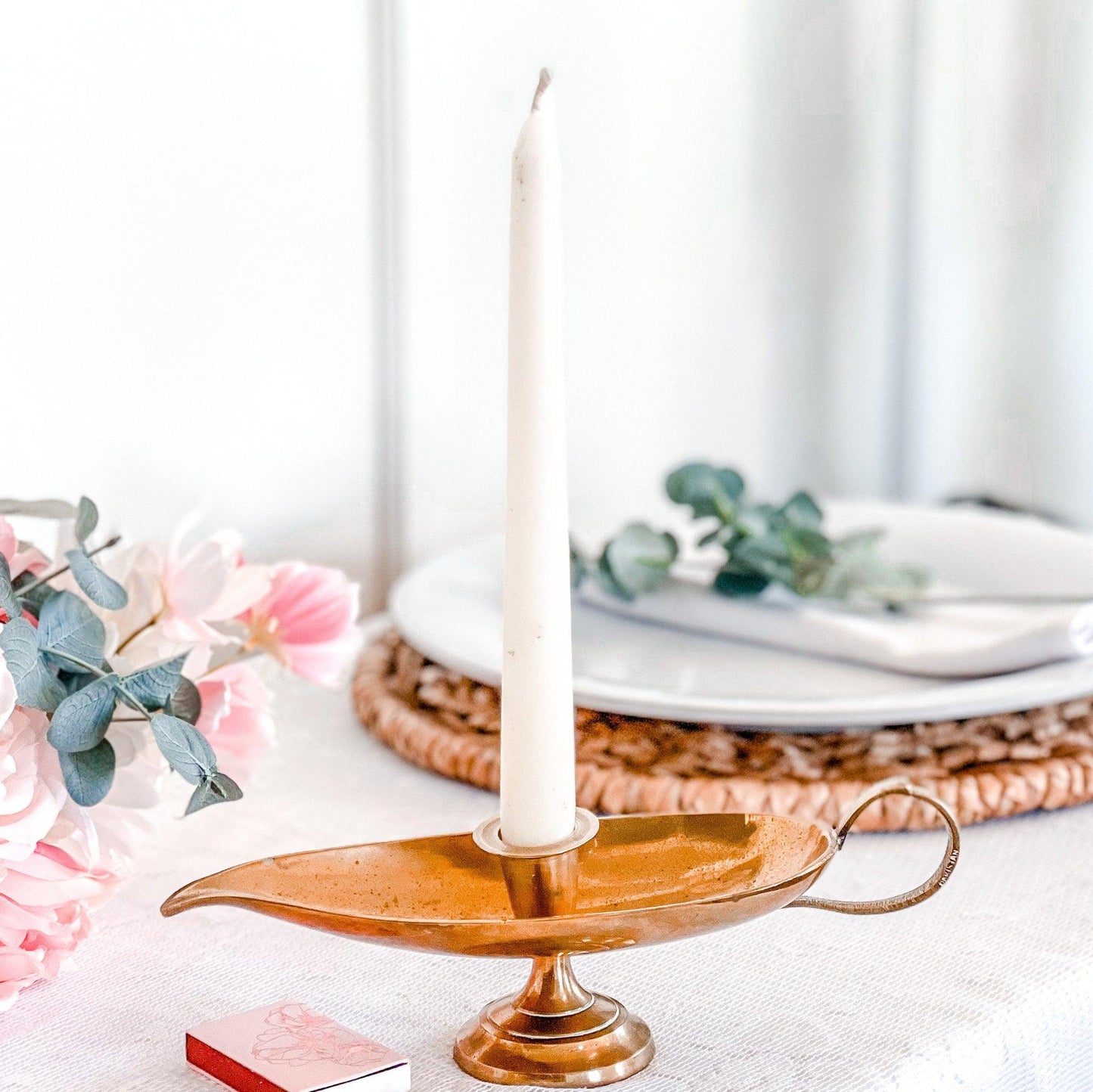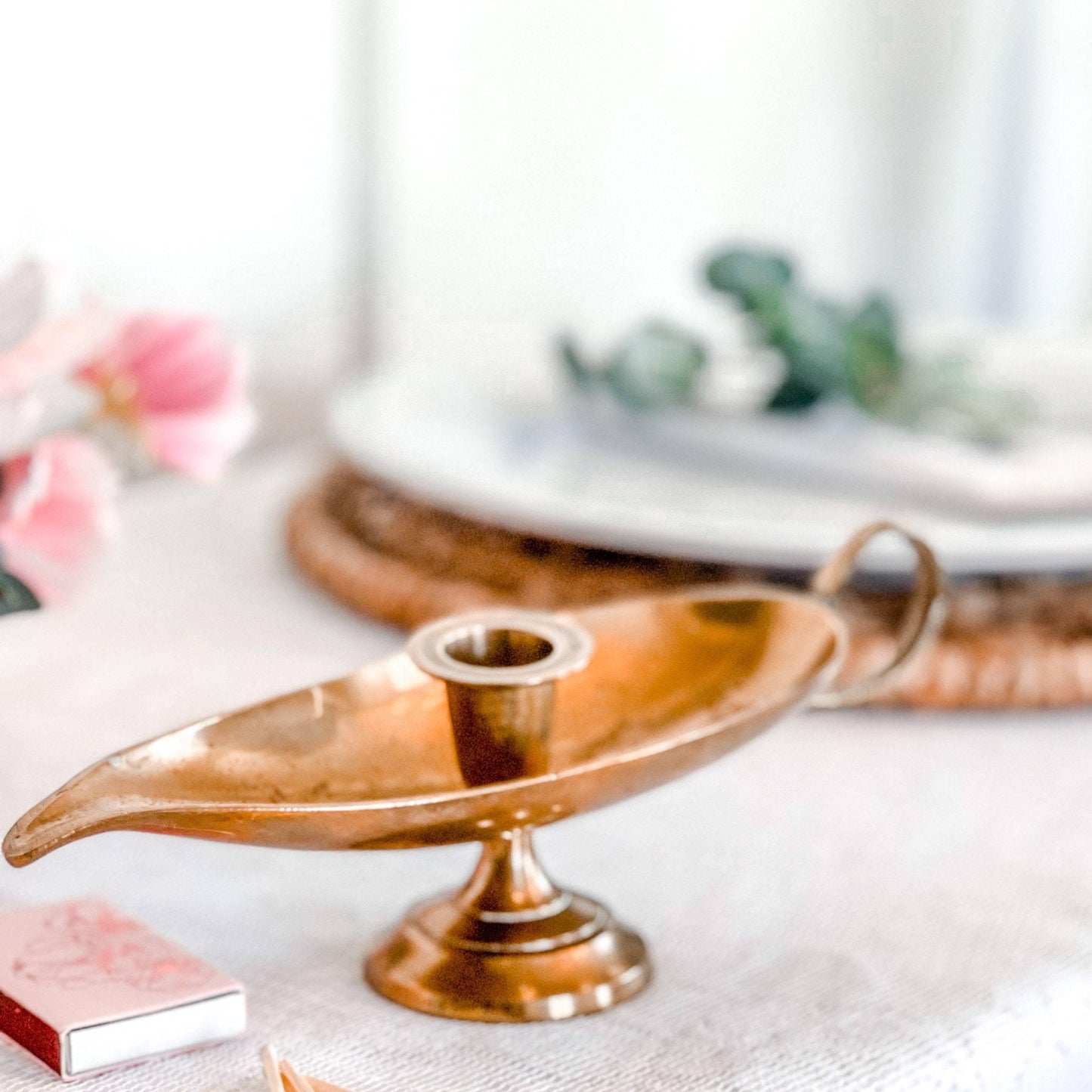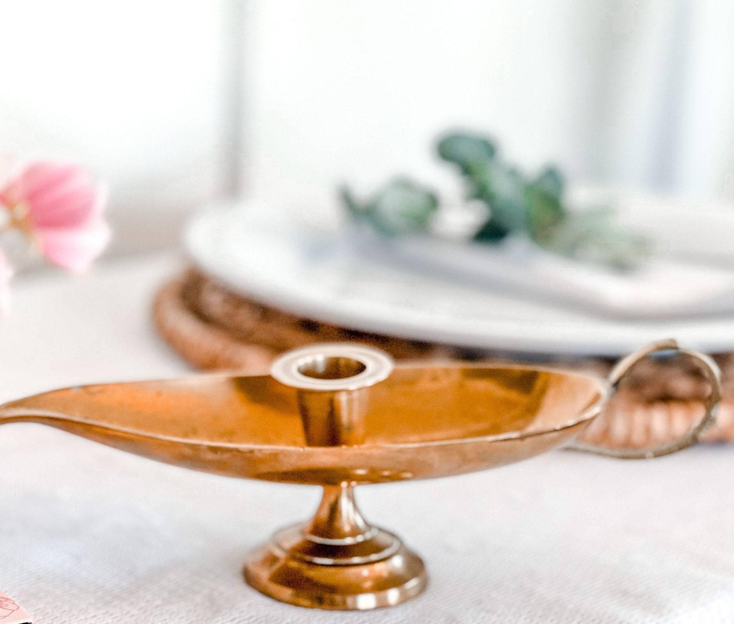This retro antique brass candle holder is shaped like a genie lamp and complete with finger loop and drip plate. Unique gift for any occasion!