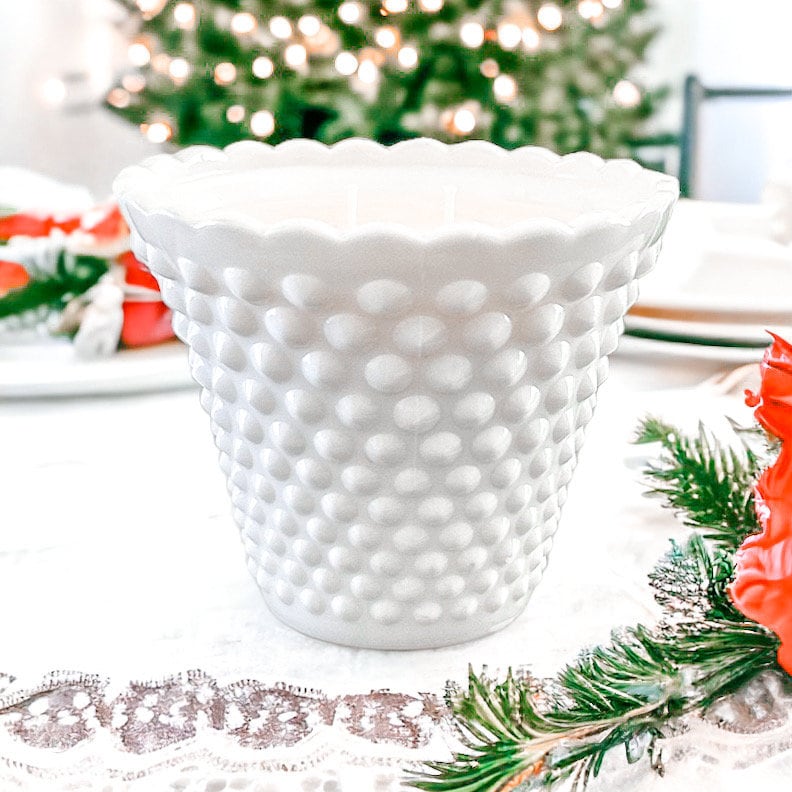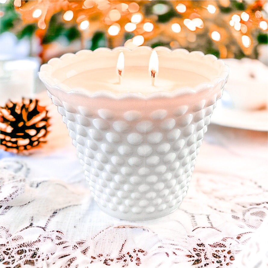 Discover the charm of our hand-poured candle in a Fenton milk glass planter. Choose from a variety of scents, including new releases. Perfect for vintage decor lovers and as thoughtful gifts. Each planter boasts a timeless hobnail pattern and nostalgic appeal. A unique touch to any space.