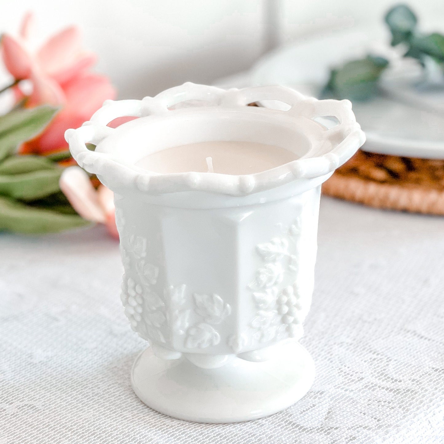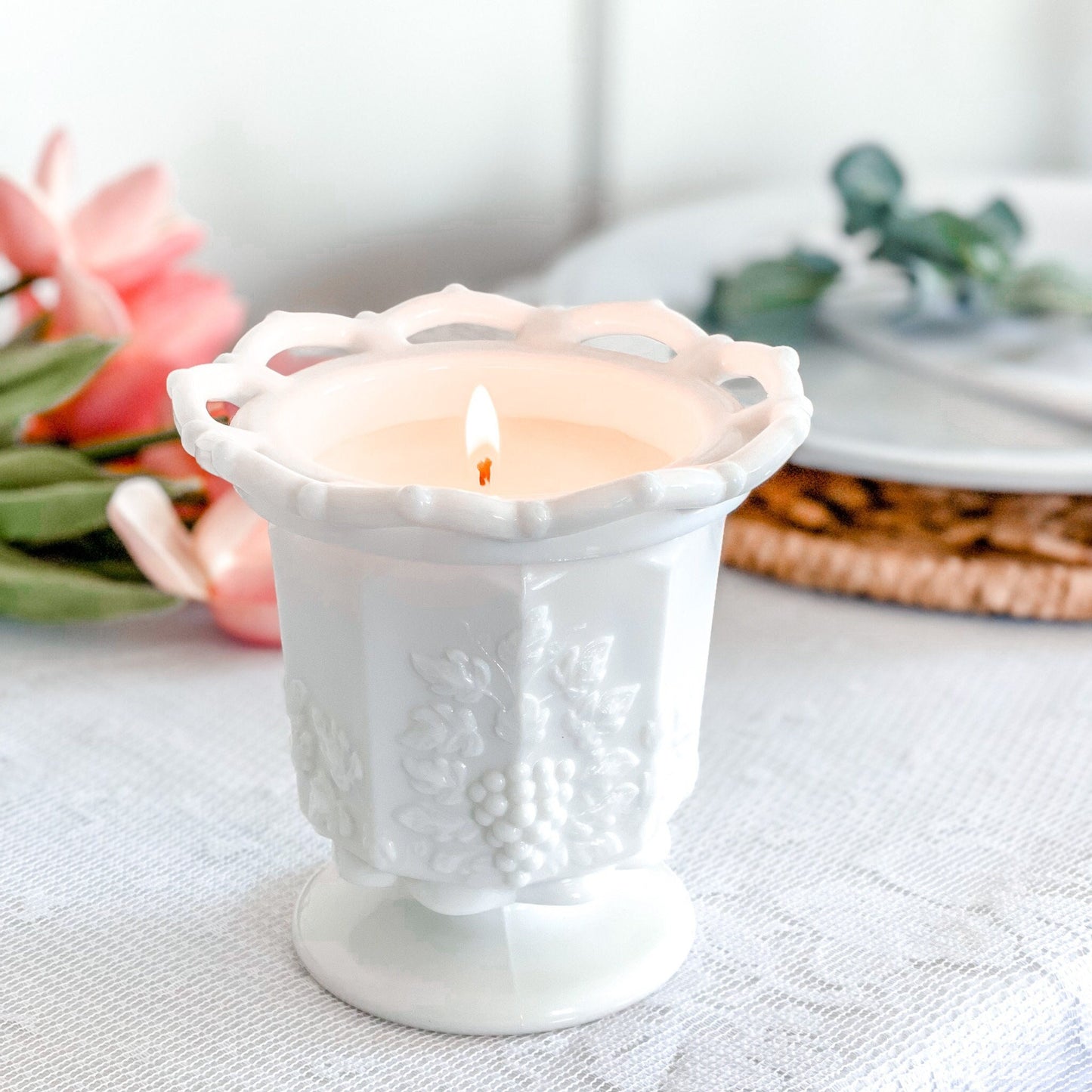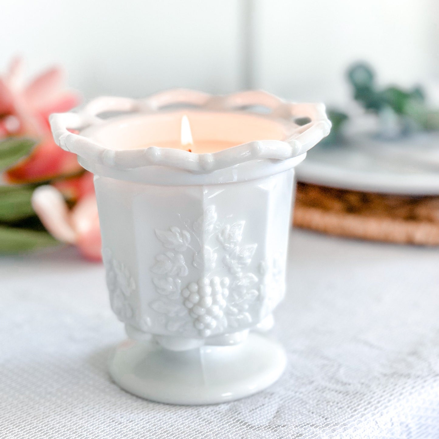Discover the elegance of our hand-poured candle, cradled in a vintage milk glass dish with a lace edge and grape pattern. Perfect for adding a touch of timeless charm to your decor or as a unique gift, this candle enhances any room with its nostalgic allure and exquisite design.