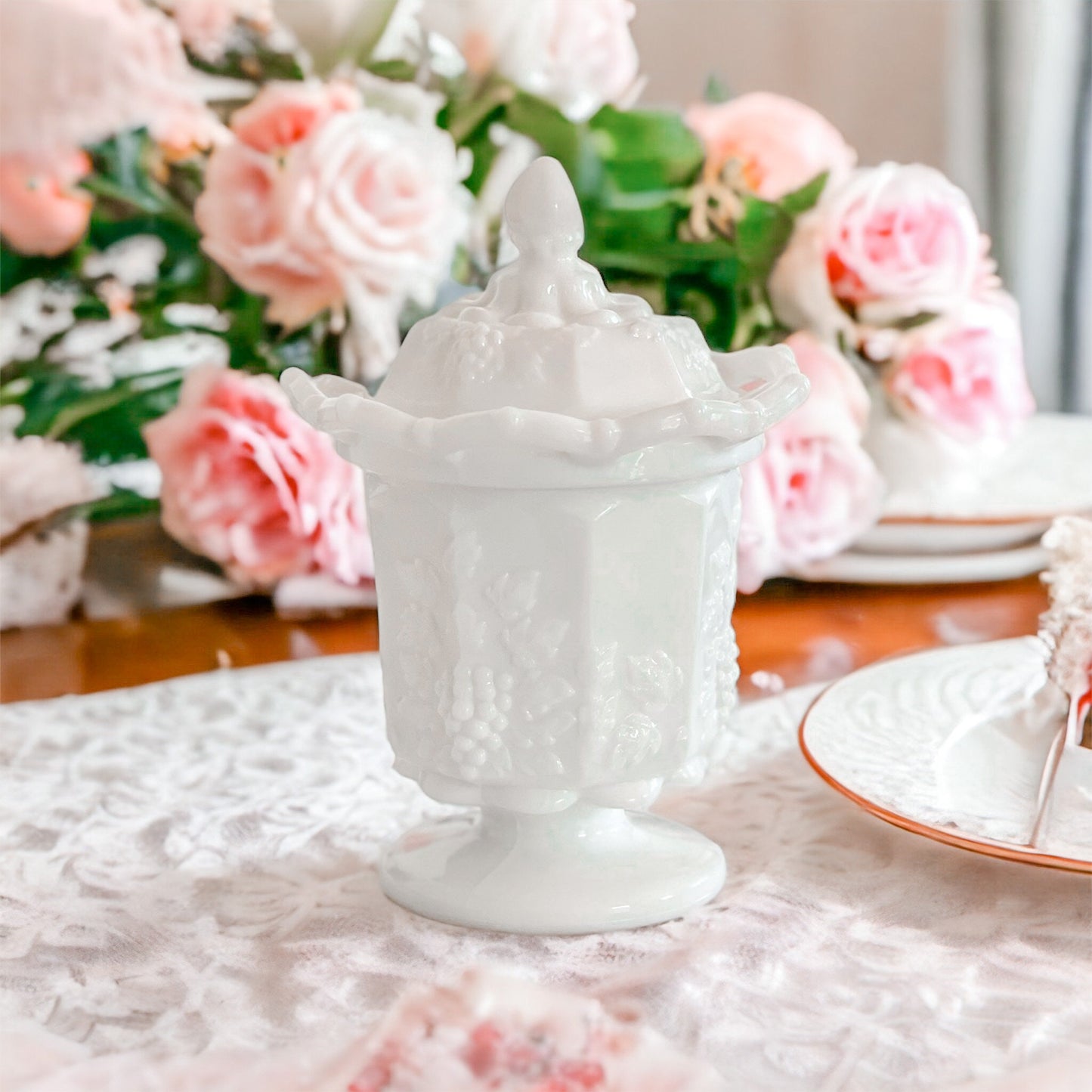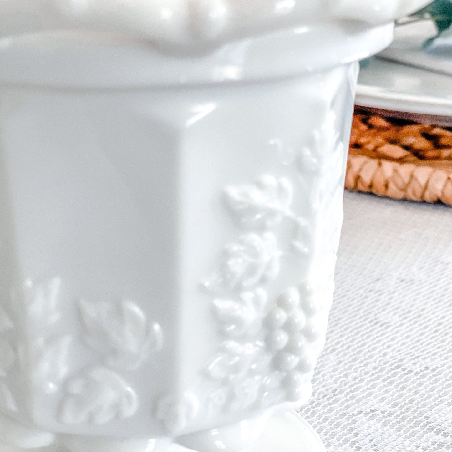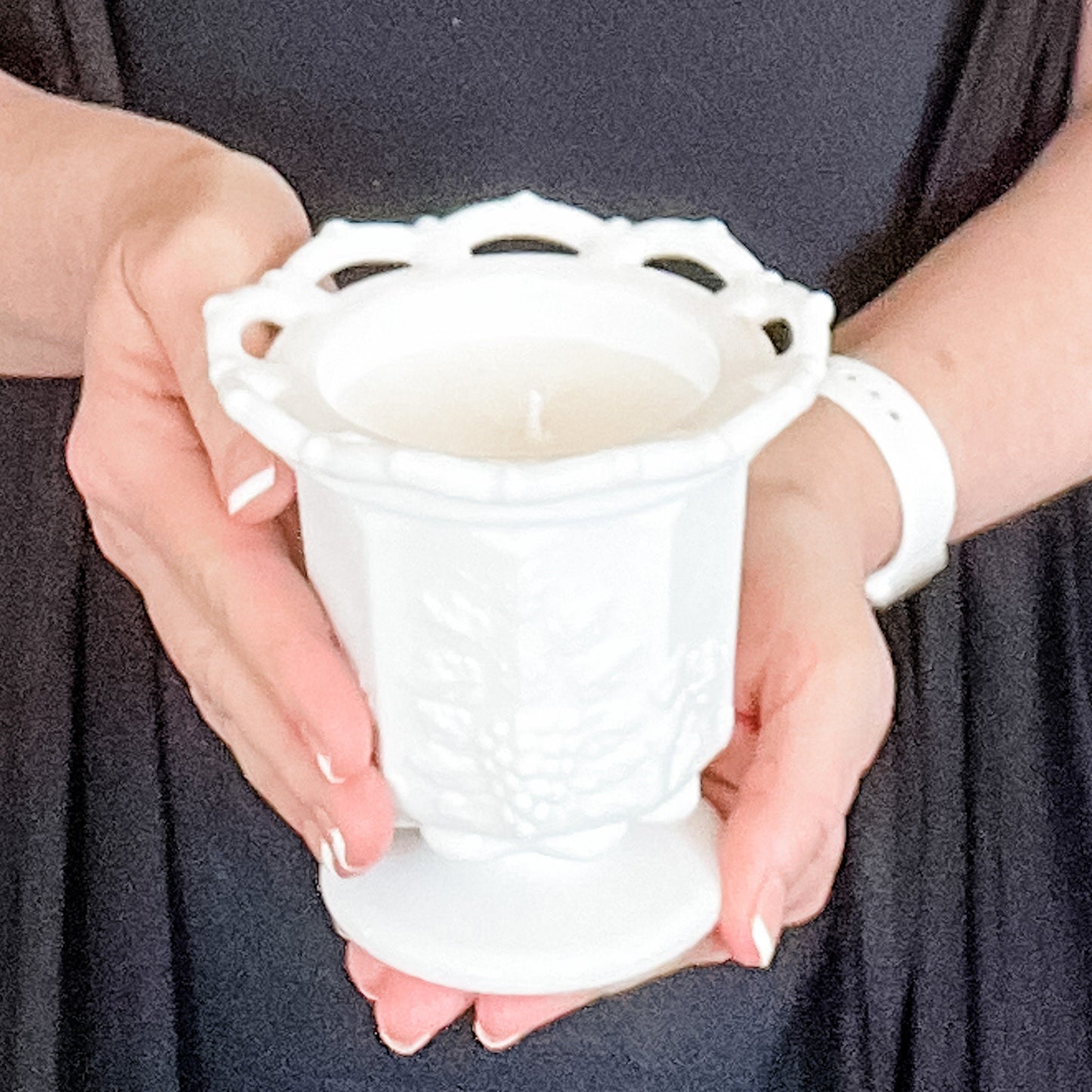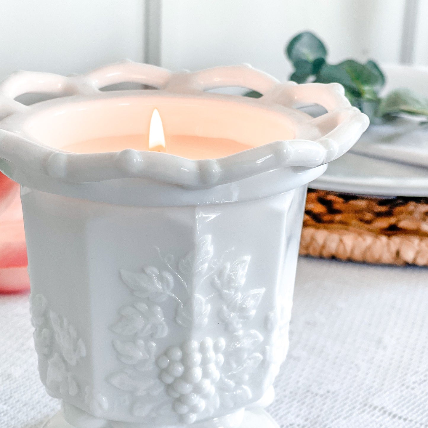 Discover the elegance of our hand-poured candle, cradled in a vintage milk glass dish with a lace edge and grape pattern. Perfect for adding a touch of timeless charm to your decor or as a unique gift, this candle enhances any room with its nostalgic allure and exquisite design.