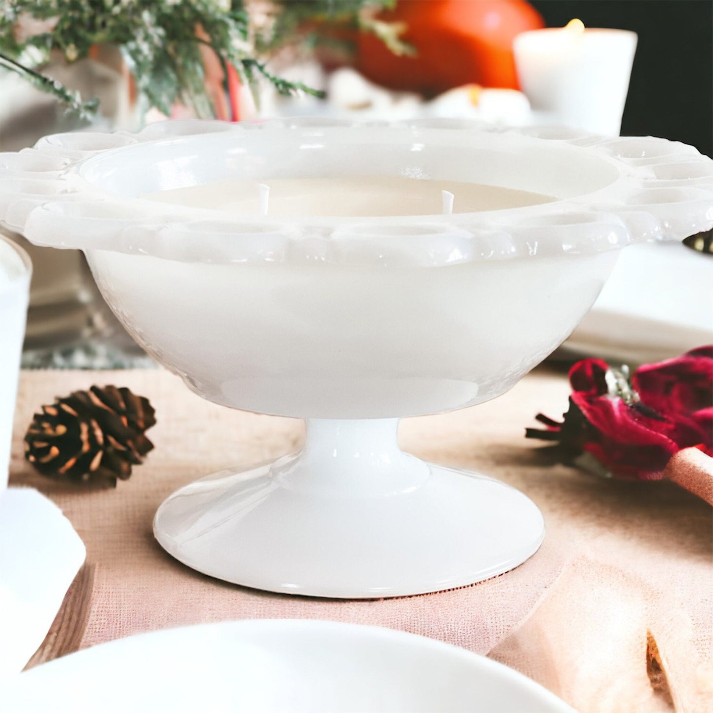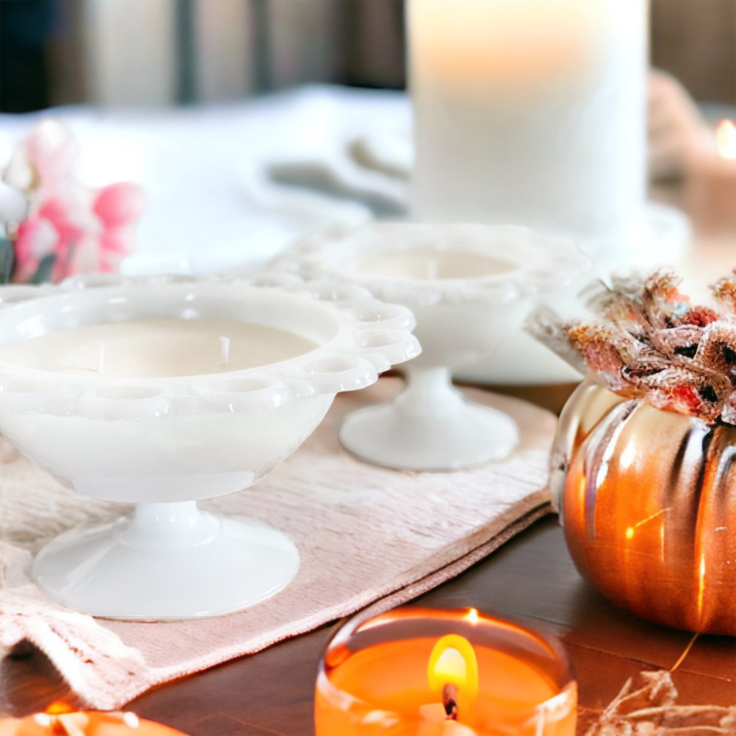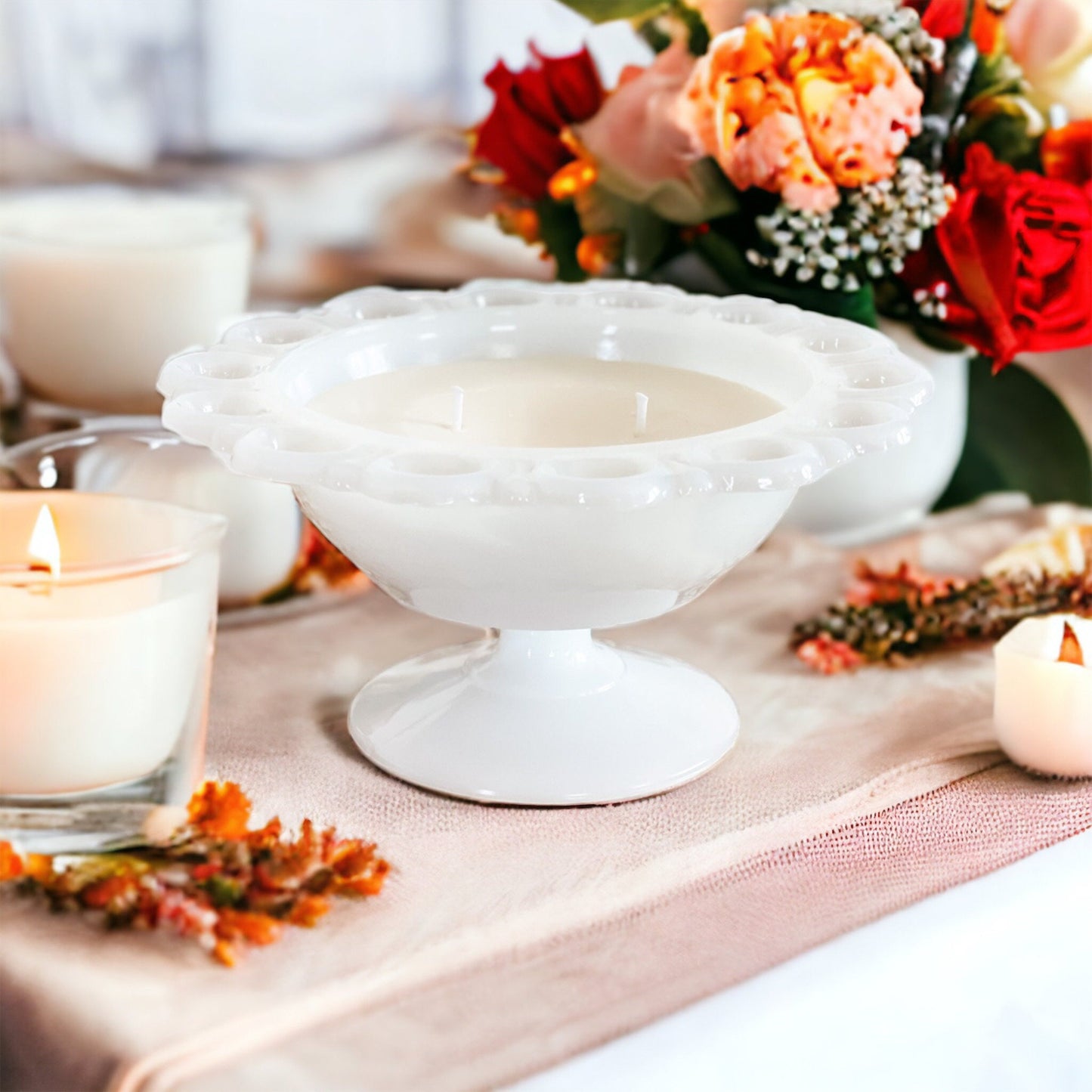 These compotes feature a stunning scalloped, lace-style rim that adds a touch of elegance. Embracing their vintage character, they may carry slight wear, enhancing their nostalgic appeal. Ideal for candle enthusiasts with a fondness for vintage decor, these compotes have been transformed into delightful pieces of repurposed home decor.
