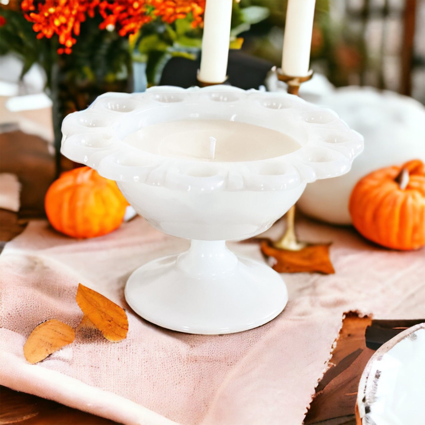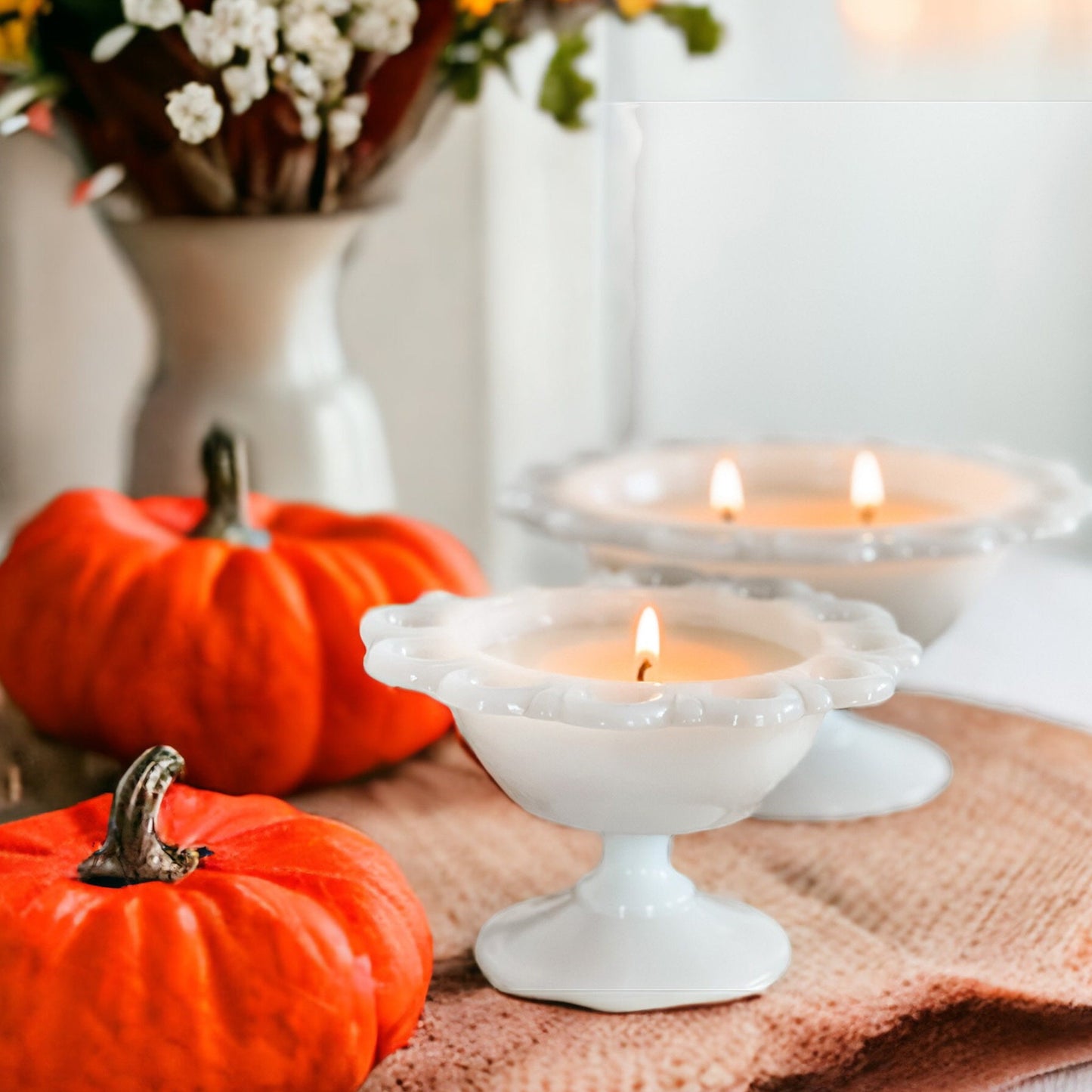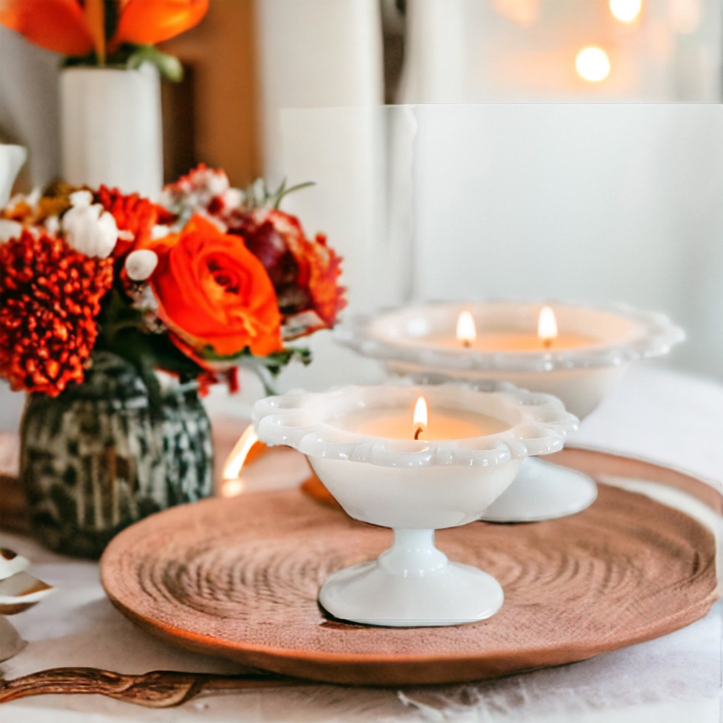 Immerse yourself in the nostalgic scent of Spiced Honey + Tonka with our hand-poured soy wax candles. Housed in classic milk glass compotes, they bring vintage charm to any space. The perfect gift for vintage decor and candle enthusiasts.