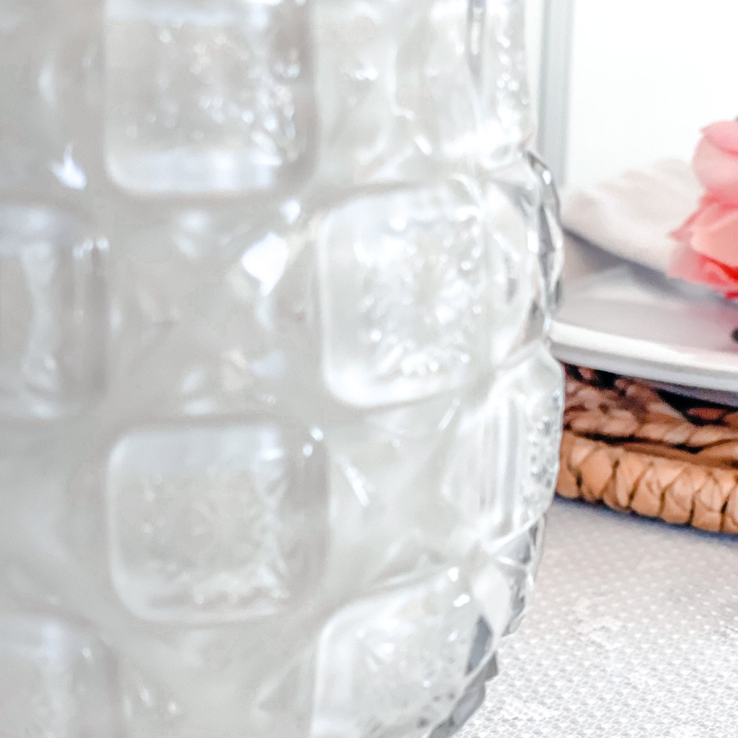 The intricate vase pattern showcased here can be traced back to the 1917 catalogue of Westmoreland Specialty Co., part of their No. 500 range, known as Old Quilt and also as Checkerboard. This pattern was later reintroduced in their milk glass line during the 1960s.