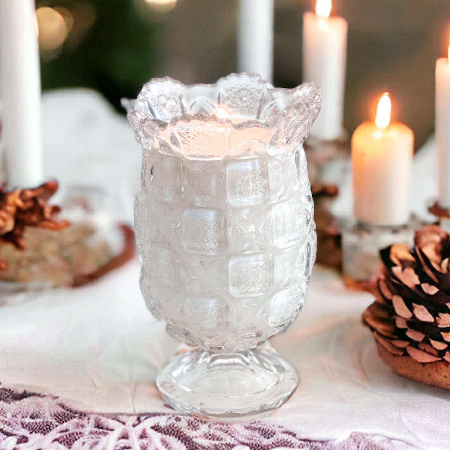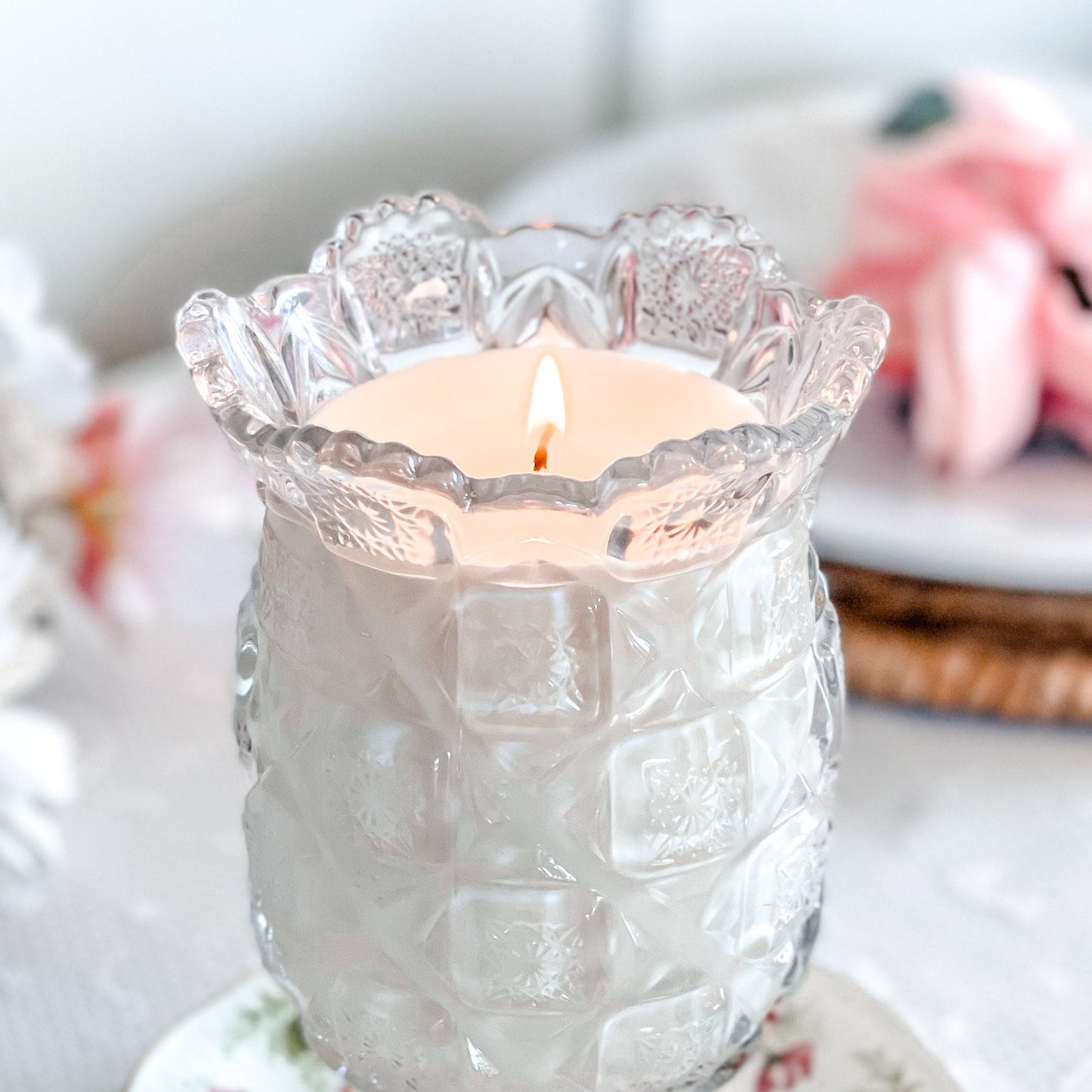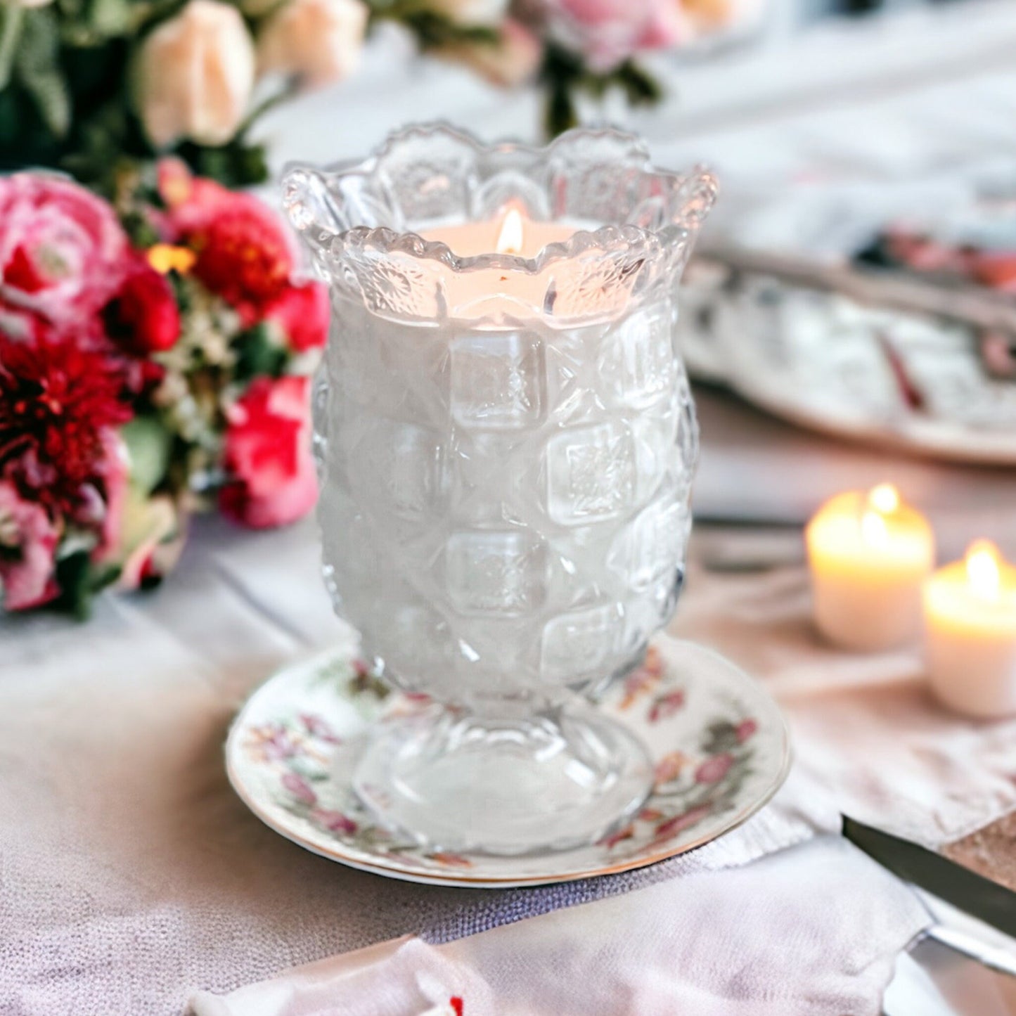 Elevate your space with a hand-poured vintage candle in a unique Old Quilt milk glass vase. Choose from Lavender Vanilla, Sea Salt & Orchid, Moonflower, or Unscented.