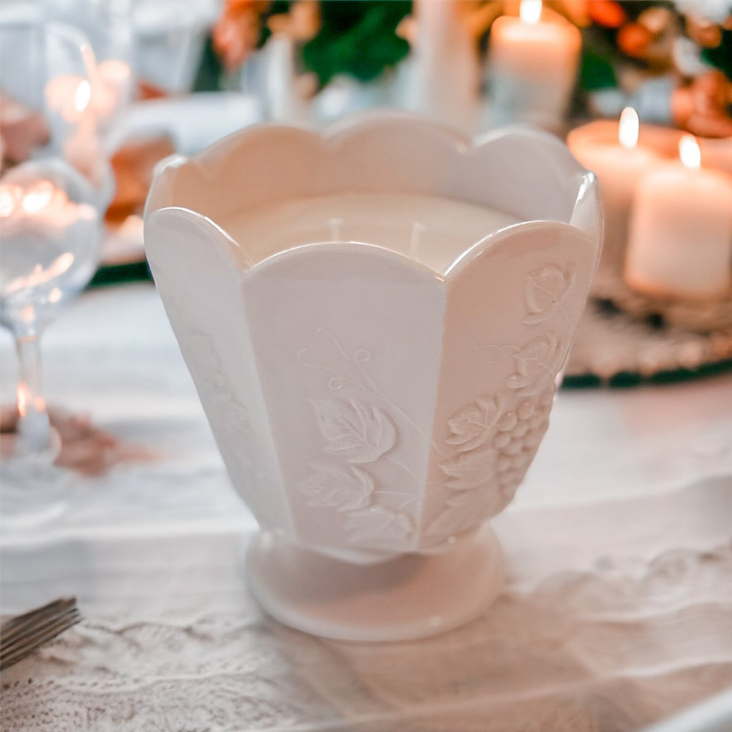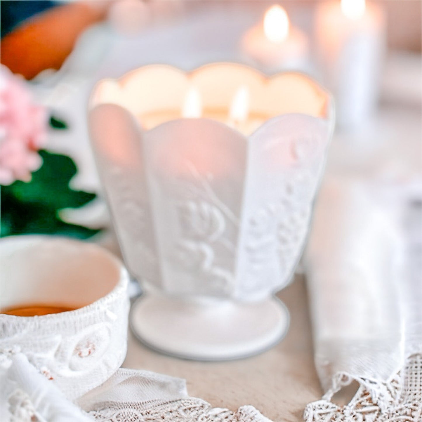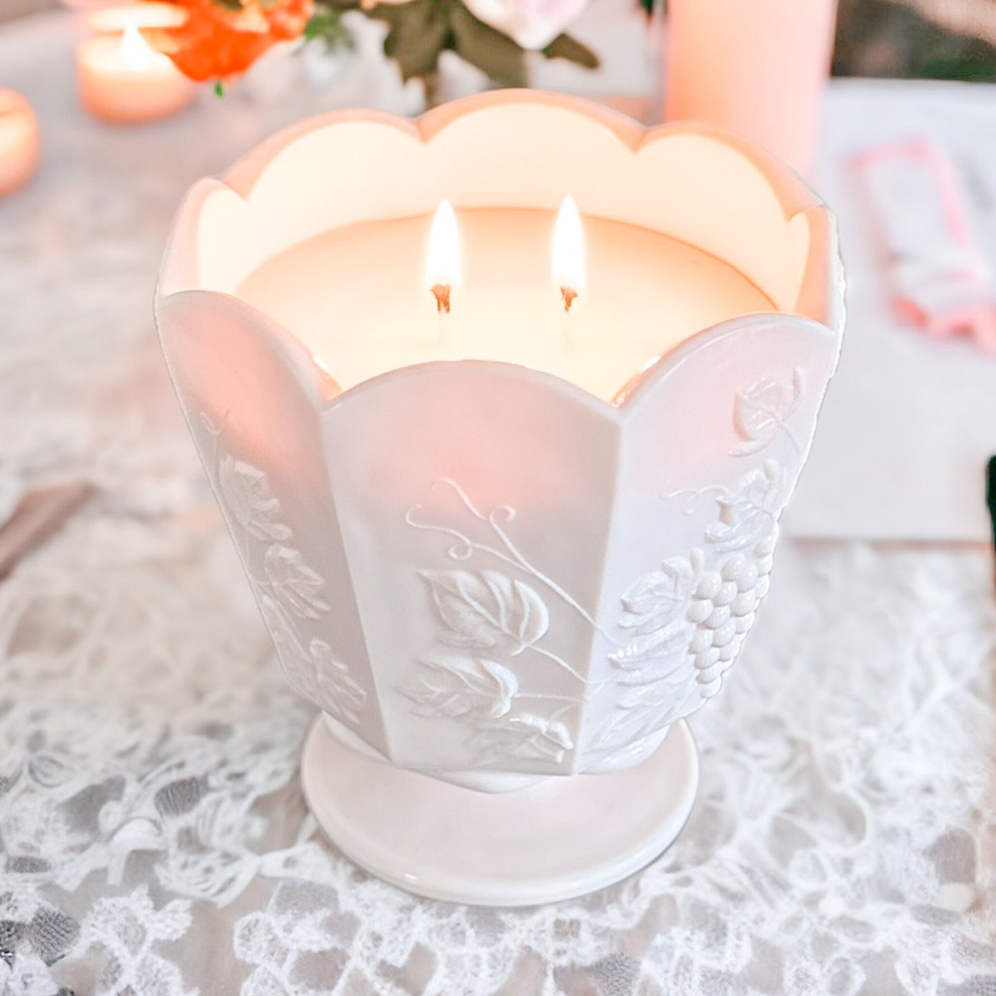 Elevate your ambiance with our hand-poured soy wax candle, nestled in a charming pink milk glass vase. Choose between Lavender Vanilla and Moonflower scents. Ideal as a gift or a treat for yourself!